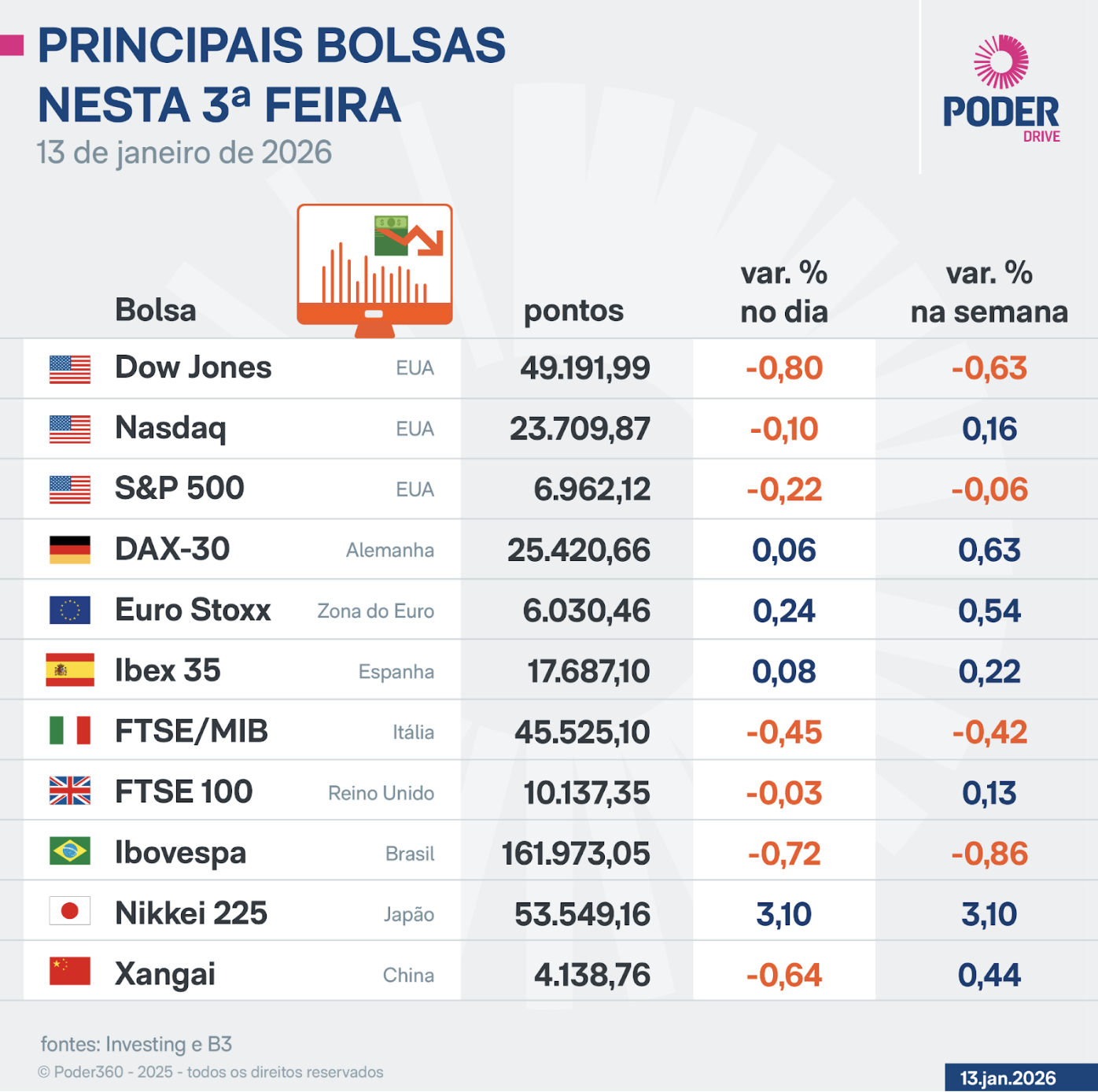 Na B3, o Ibovespa encerrou o pregão aos 161.973,05 pontos, com recuo diário de 0,72%. Já havia terminado a 2ª feira (12.jan) em queda.
