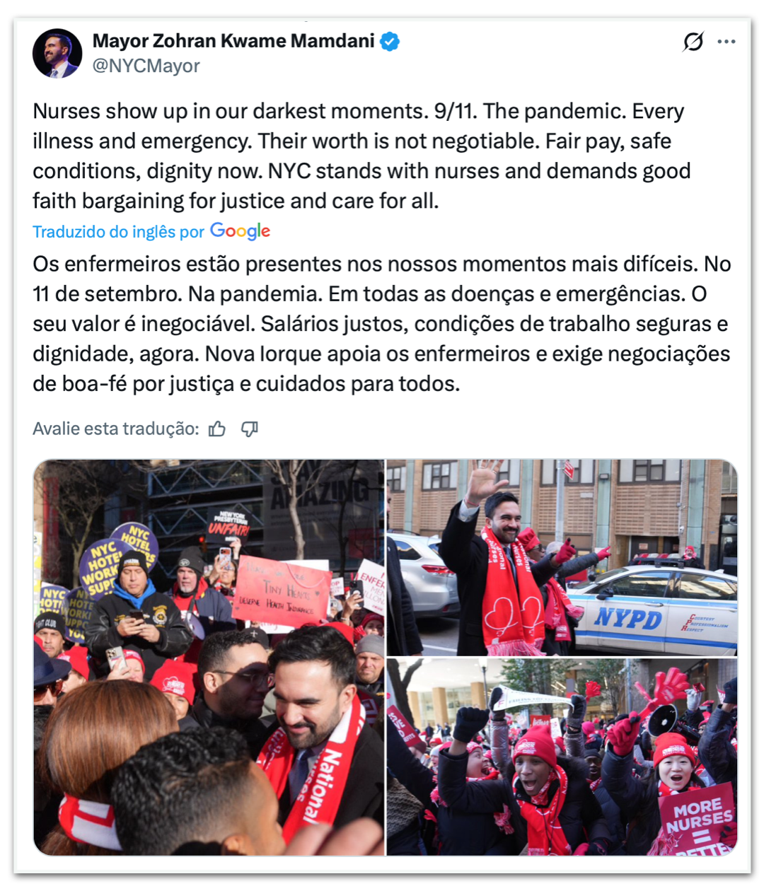 Em publicação no X, o prefeito de Nova York escreveu: “Os enfermeiros estão presentes nos nossos momentos mais difíceis. No 11 de Setembro. Na pandemia. Em todas as doenças e emergências. O seu valor é inegociável. Salários justos, condições de trabalho seguras e dignidade, agora. Nova York apoia os enfermeiros e exige negociações de boa-fé por justiça e cuidados para todos”.