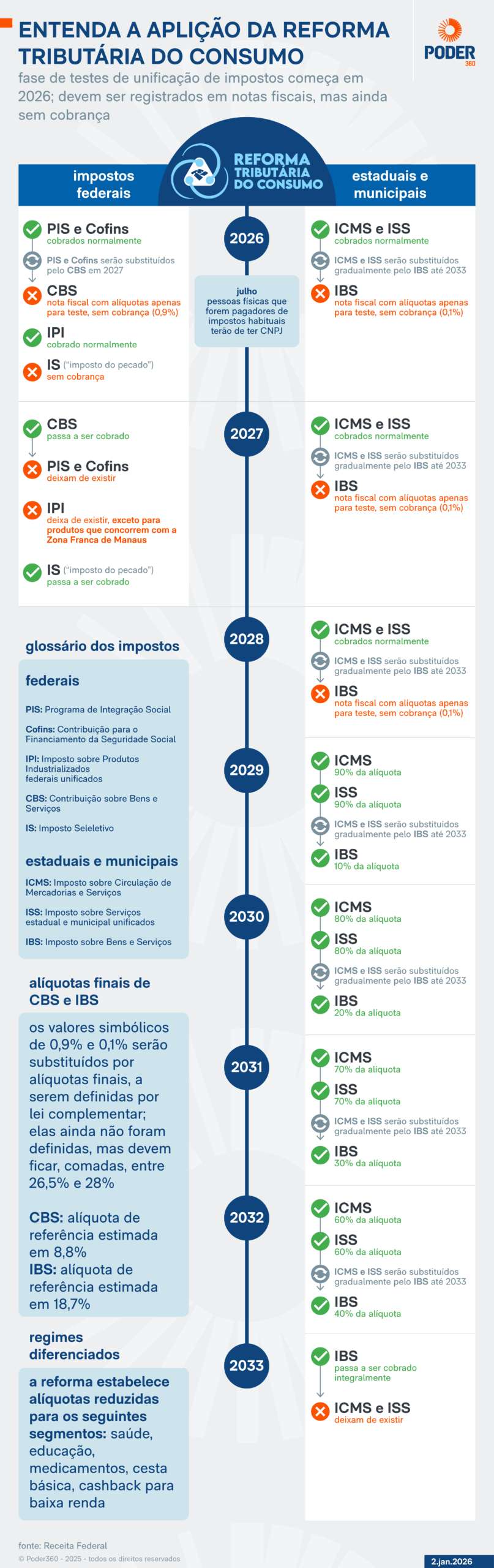 - 2027 – começa a cobrança plena da CBS (federal), e os antigos PIS (Programa de Integração Social) e Cofins (Contribuição para o Financiamento da Seguridade Social) deixam de existir;