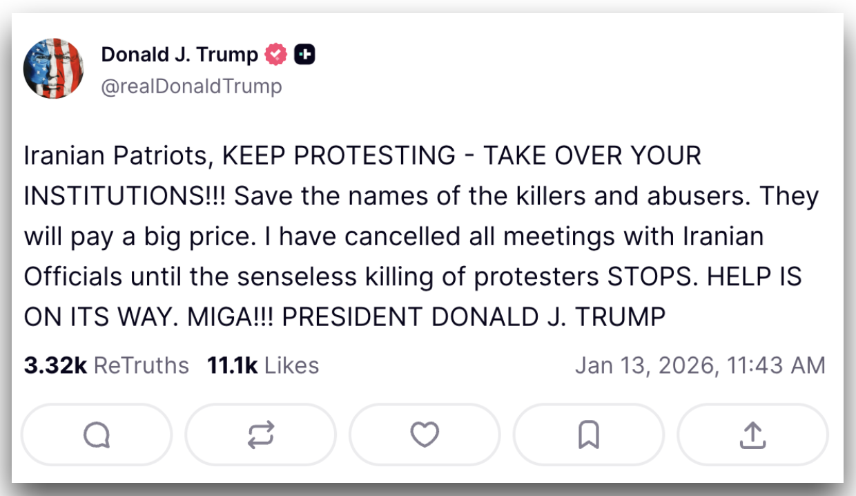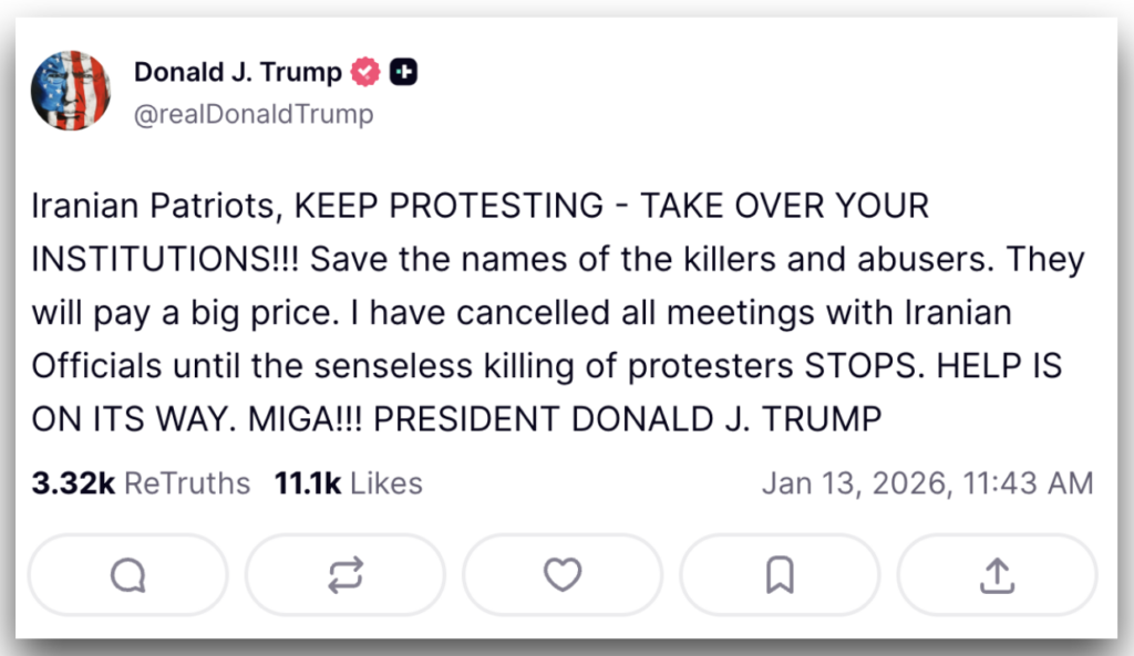 “Patriotas iranianos, CONTINUEM A PROTESTAR — TOMEM SUAS INSTITUIÇÕES!!! Guarde os nomes dos assassinos e abusadores. Eles pagarão um grande preço. Eu cancelei todas as reuniões com autoridades iranianas até que essa matança sem sentido de manifestantes ACABE. SOCORRO ESTÁ A CAMINHO. MIGA!!! [Make Iran Great Again]”, escreveu Trump na rede social