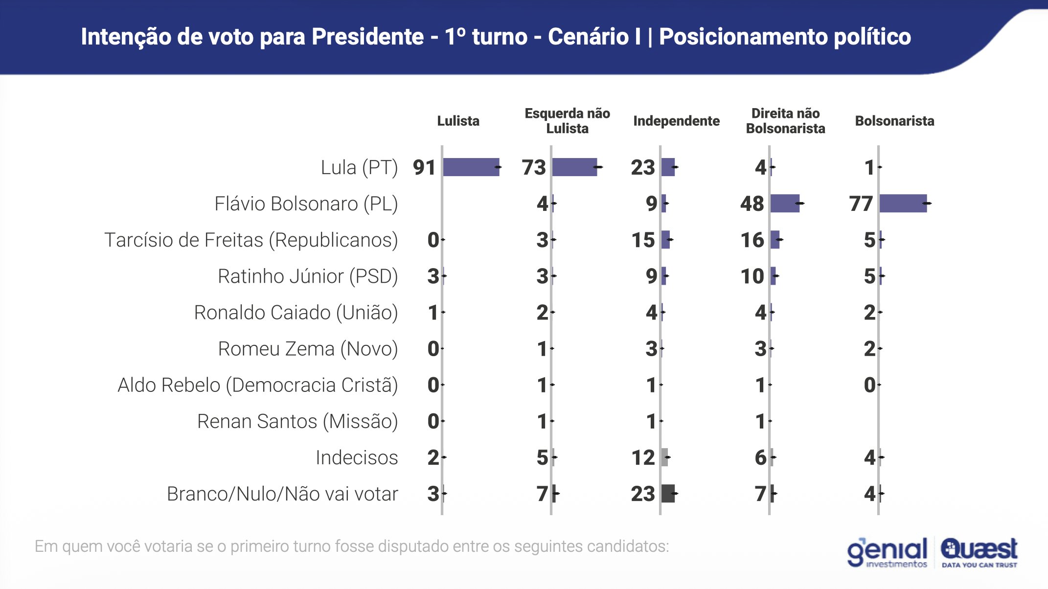 No grupo considerado como “independente”, 23% votariam em Lula contra 15% em Tarcísio e 9% em Flávio.