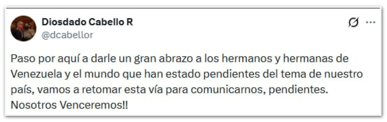 “Passando por aqui para mandar um grande abraço aos nossos irmãos e irmãs na Venezuela e em todo o mundo que têm acompanhado a situação em nosso país. Voltaremos a nos comunicar por este canal, fiquem ligados. Venceremos!!”, disse Cabello.