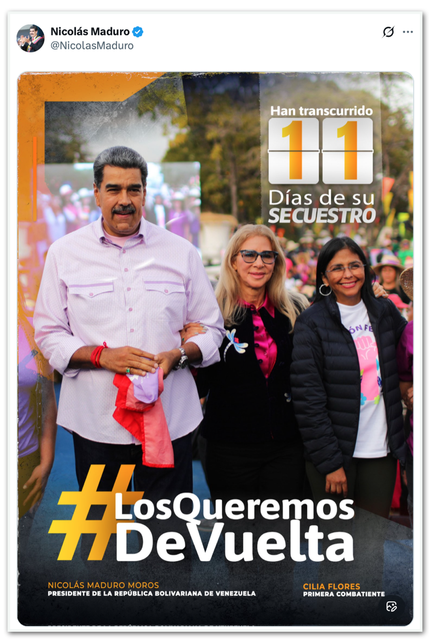 A conta de Maduro no X também foi reativada na 3ª feira (13.jan). Em seu perfil, foi publicada uma foto do presidente deposto ao lado de Rodríguez e Flores, acompanhada da legenda: “Já se passaram 11 dias desde o sequestro deles”.