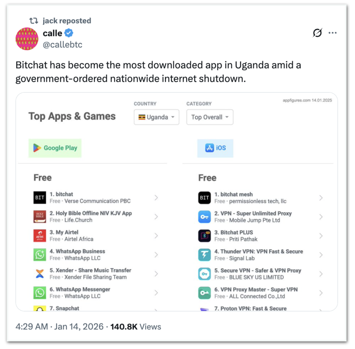 Neste momento, o Bitchat é o aplicativo mais baixado em Uganda, e o próprio Dorsey compartilhou uma publicação que falava sobre esse fato.