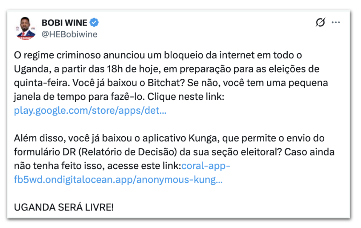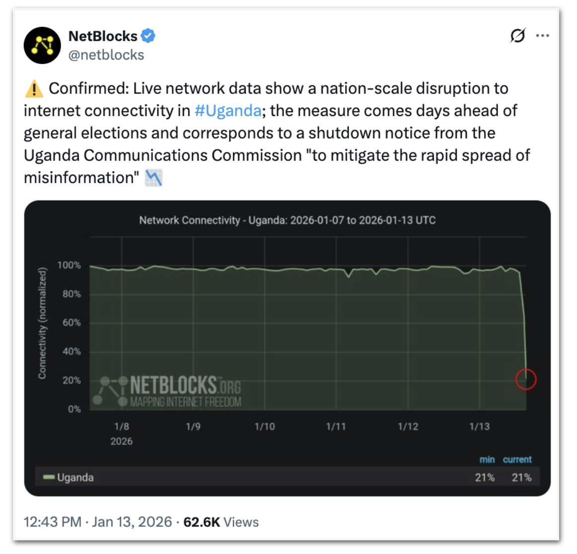 “Confirmado: dados de rede em tempo real mostram uma interrupção na conectividade da internet em escala nacional em Uganda; a medida ocorre dias antes das eleições gerais e corresponde a um aviso de desligamento da Comissão de Comunicações de Uganda ‘para mitigar a rápida disseminação de desinformação’”, escreveu