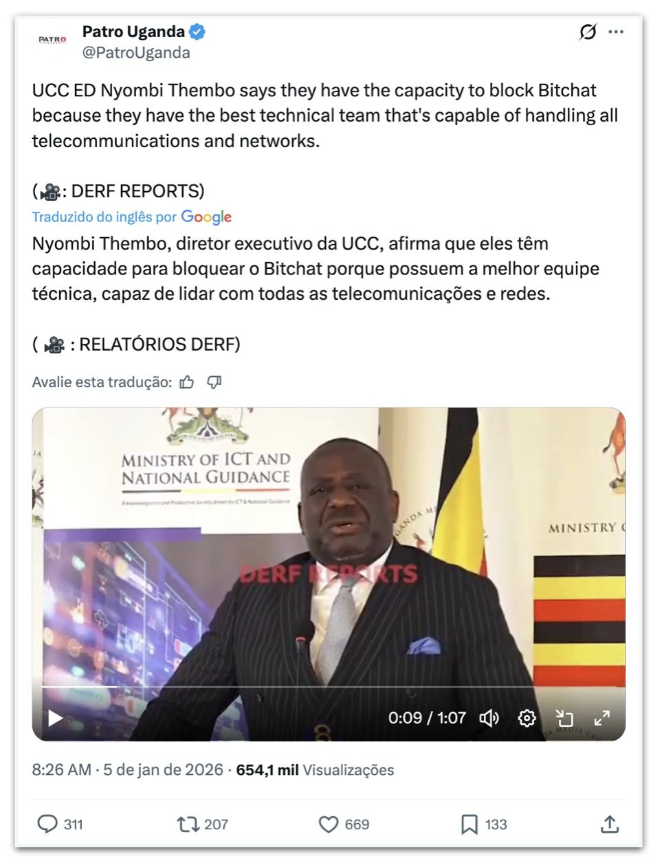 Ao ser questionado sobre o uso do aplicativo em Uganda, o diretor-executivo da UCC, Nyombi Thembo, chegou a afirmar, em declaração oficial, que o governo teria capacidade de bloquear o Bitchat em todo o país.