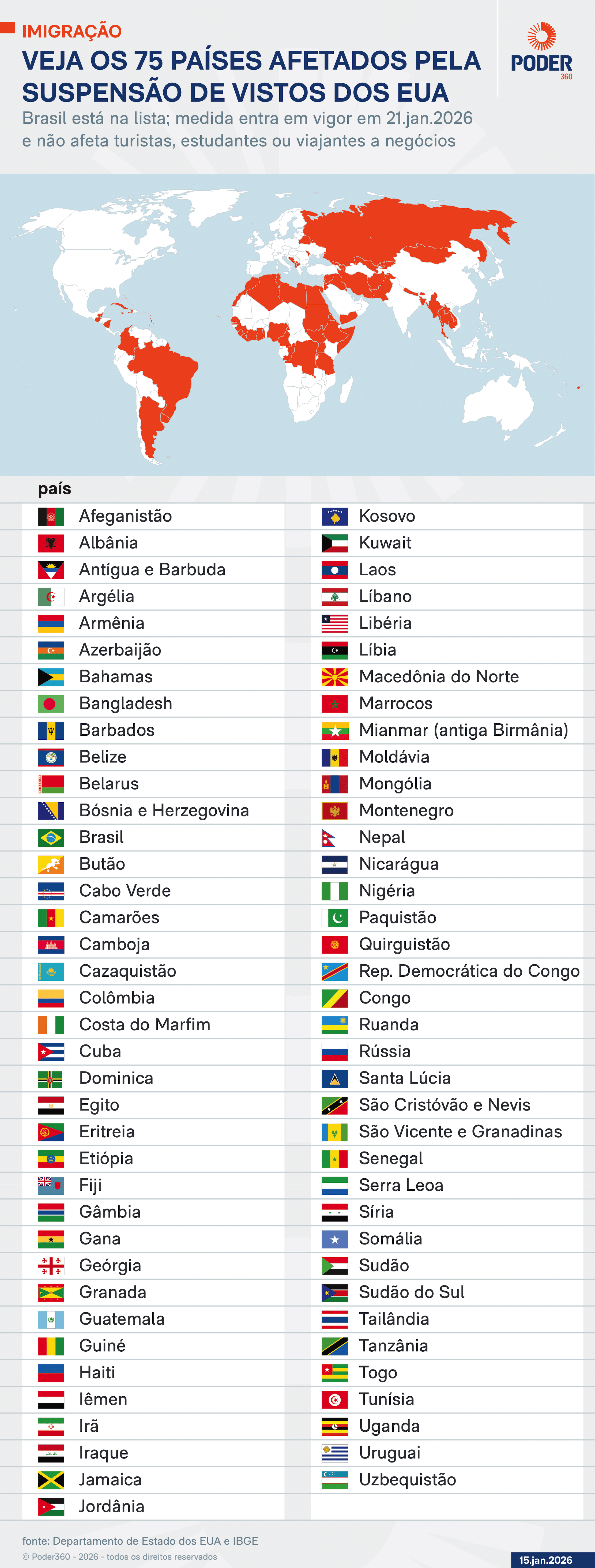 O governo dos Estados Unidos anunciou na 4ª feira (14.jan.2026) a suspensão por tempo indeterminado da emissão de novos vistos de imigração para pessoas de 75 países, incluindo o Brasil. A medida passa a valer em 21 de janeiro e não interfere nos pedidos de visto para turistas ou para quem viaja a negócios ou estudos ao território norte-americano. O foco são pessoas que buscam residência permanente.