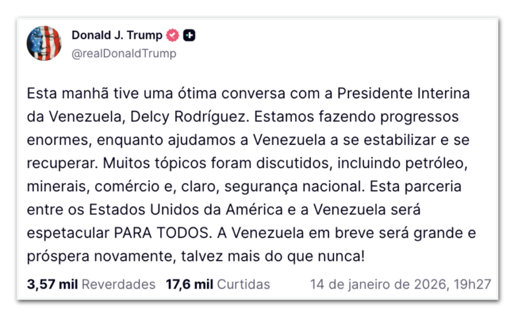 A conversa com Trump se dá em um momento de grande influência norte-americana sobre a Venezuela. Assim que Maduro foi capturado, o republicano disse que passaria a governar o país latino, com foco em exploração do petróleo venezuelano. Chegou a ameaçar novos ataques caso Delcy não cooperasse. Ela, no entanto, disse que não havia agentes externos interferindo em sua governança.