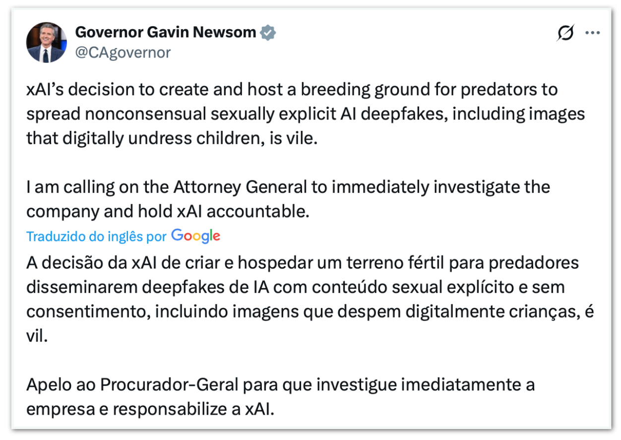 O anúncio se deu horas depois de o procurador-geral da Califórnia, Rob Bonta, afirmar que seu gabinete investiga a xAI por uma aparente produção em larga escala de imagens íntimas falsas e sem consentimento. No mesmo dia, o governador da Califórnia, Gavin Newsom (Partido Democrata), criticou publicamente a decisão inicial da empresa de permitir esse tipo de conteúdo, classificando o ambiente criado como propício à disseminação de deepfakes sexuais, inclusive envolvendo crianças.