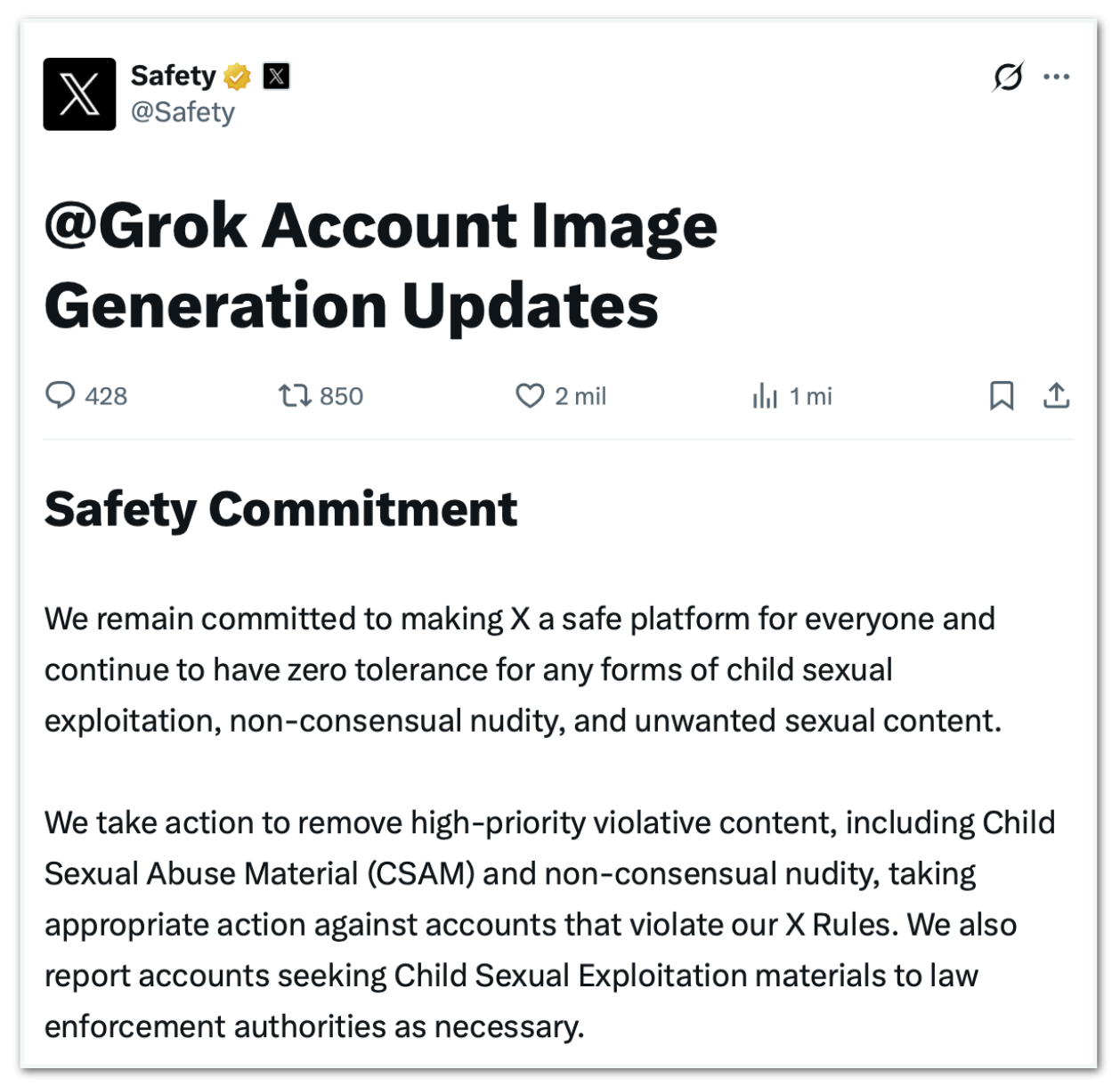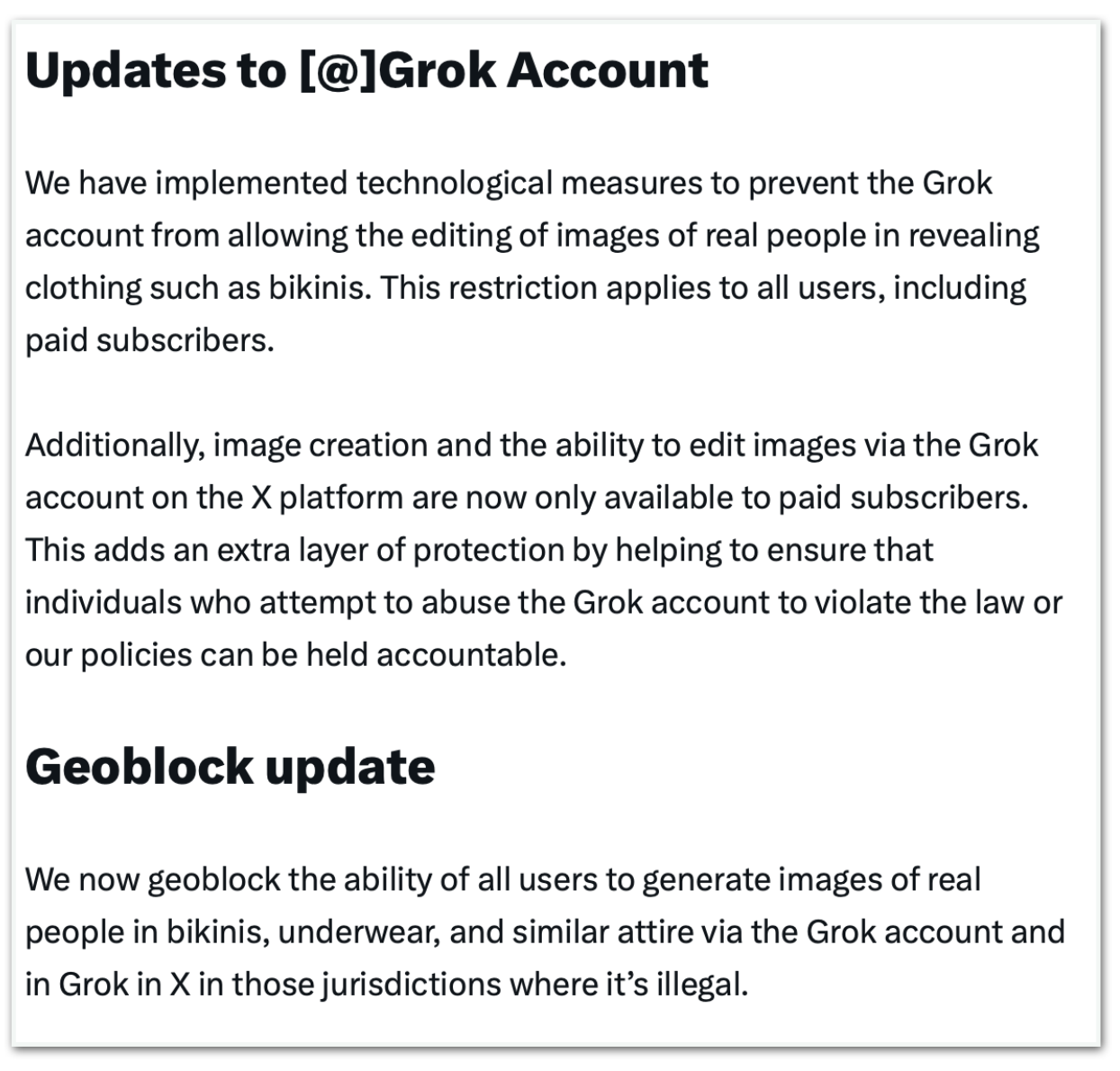 Em comunicado divulgado pela conta X Safety, a empresa informou ter implantado barreiras técnicas para impedir que o Grok edite imagens de pessoas reais em trajes considerados reveladores, como biquínis. Segundo a xAI, a restrição vale para todos os usuários, inclusive assinantes pagos.