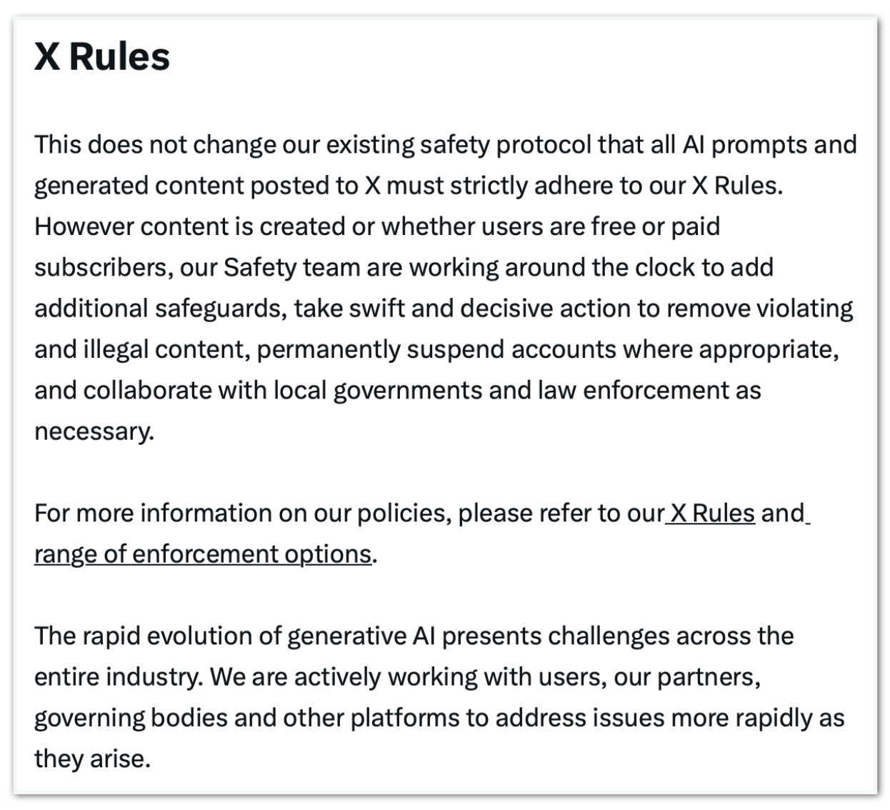O X disse ter tolerância zero à exploração sexual infantil, nudez sem consentimento e conteúdo sexual indesejado. A empresa afirmou remover material ilegal com prioridade, suspender contas reincidentes e comunicar autoridades quando necessário. Também informou que passou a bloquear, por região, a criação de imagens de pessoas reais em trajes íntimos onde a prática é ilegal, mantendo a exigência de que todo conteúdo criado por IA siga estritamente as regras da plataforma.
