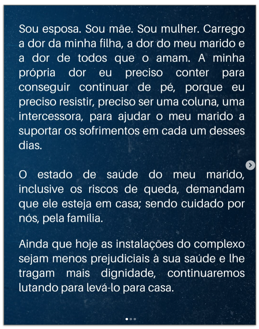 Michelle declarou que carrega a dor do marido, da filha e de todos que o amam e que precisa se manter firme para apoiá-lo. Segundo ela, embora as atuais instalações da Papudinha ofereçam mais dignidade e menos prejuízos à saúde do ex-presidente, a família continuará lutando para que ele possa cumprir a pena em casa.