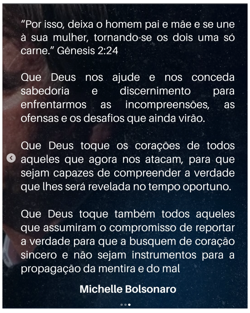 Na publicação, a ex-primeira-dama citou o versículo de Gênesis 2:24 para reforçar a união do casal e afirmou que fará tudo pelo marido, que, segundo ela, dedicou a própria vida ao Brasil e aos brasileiros. Ao final, pediu sabedoria para enfrentar os desafios e disse esperar que a imprensa atue com compromisso com a verdade.
