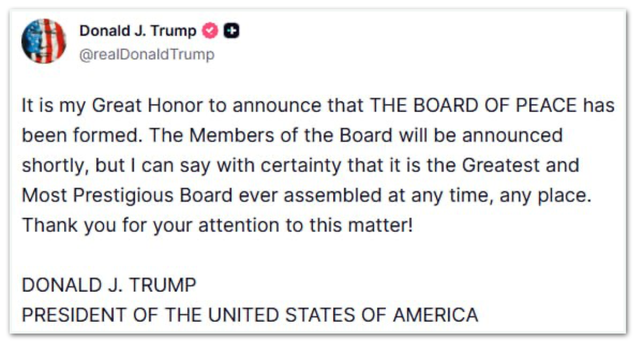 “É uma grande honra anunciar que o CONSELHO DA PAZ foi formado”, declarou Trump em uma publicação na plataforma Truth Social. “Os integrantes do conselho serão anunciados em breve, mas posso afirmar com certeza que este é o maior e mais prestigioso conselho já reunido, em qualquer época e lugar”, disse.