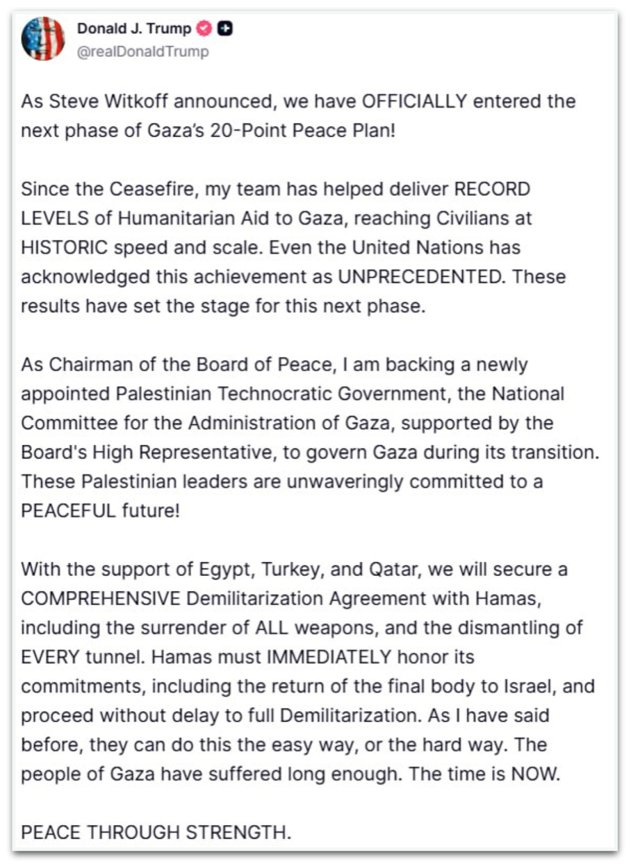 “Como presidente do Conselho da Paz, apoio um governo tecnocrático palestino recém-nomeado, o Comitê Nacional para a Administração de Gaza, apoiado pelo Alto Representante do Conselho, para governar Gaza durante sua transição. Esses líderes palestinos estão firmemente comprometidos com um futuro PACÍFICO!”, disse.