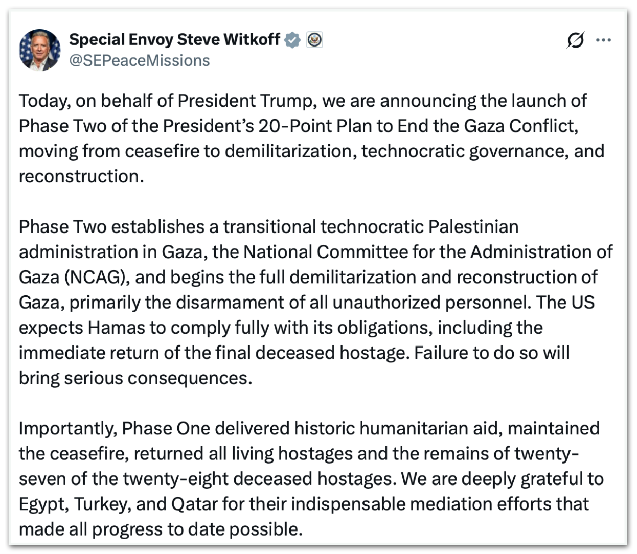 Na 4ª feira (14.jan), Witkoff já havia anunciado o início da 2ª fase do plano dos EUA para a paz na Faixa de Gaza. “A fase 2 estabelece uma administração tecnocrática palestina de transição em Gaza, o NCAG (Comitê Nacional para a Administração de Gaza), e inicia a desmilitarização total e a reconstrução de Gaza, principalmente o desarmamento de todo o pessoal não autorizado”, declarou na rede social X.