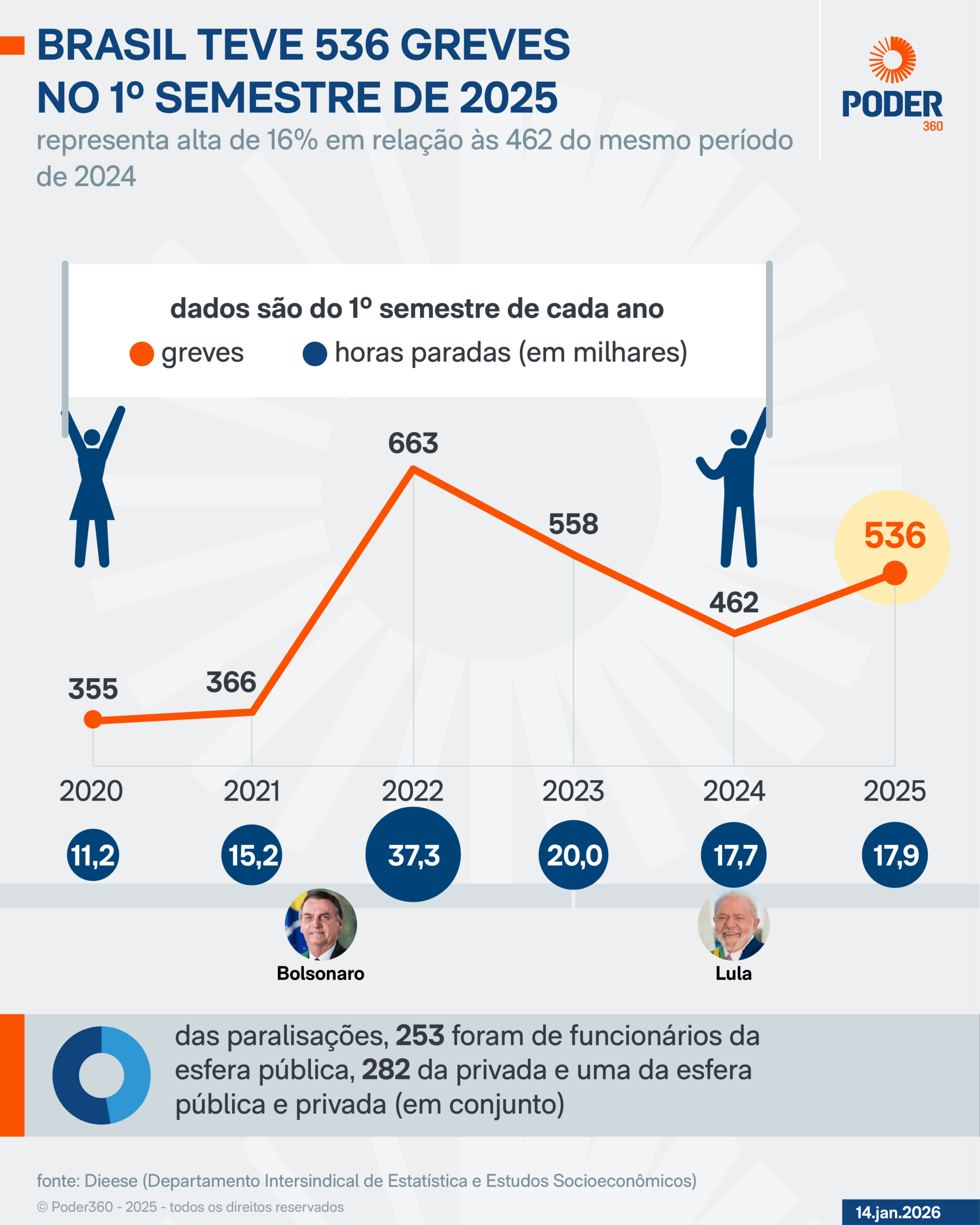 O Brasil registrou 536 greves no 1º semestre de 2025. O número representa alta de 16% em relação às 462 paralisações do mesmo período de 2024. O total de horas paradas nos 6 primeiros meses do ano passado foi de 17.877.