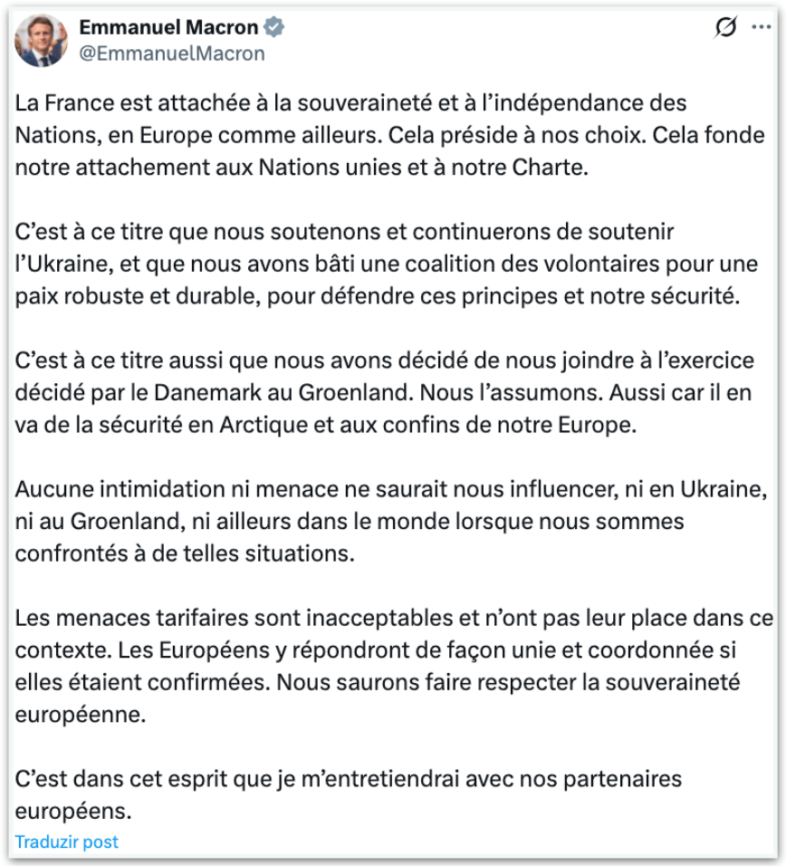 “Nenhuma intimidação ou ameaça pode nos influenciar, nem na Ucrânia, nem na Groenlândia, nem em qualquer outro lugar do mundo quando nos deparamos com tais situações. As ameaças tarifárias são inaceitáveis e não têm lugar neste contexto. Os europeus responderão de forma unida e coordenada caso sejam confirmadas. Garantiremos que a soberania europeia seja respeitada. É nesse espírito que falarei com nossos parceiros europeus”, escreveu Macron em seu perfil no X (antigo Twitter).