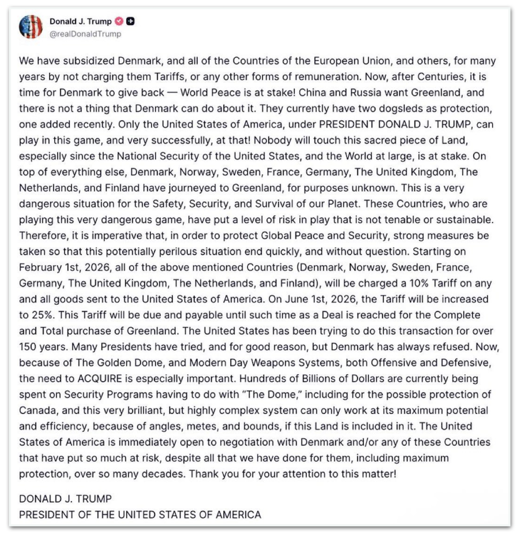 Trump anunciou em sua rede social Truth Social a tarifa de 10% para todas as mercadorias importadas da Dinamarca, Noruega, Suécia, França, Alemanha, Reino Unido, Holanda e Finlândia. Entra em vigor em 1º de fevereiro e pode subir para 25% caso nenhuma resolução sobre a compra da Groenlândia seja alcançada até 1º de junho.