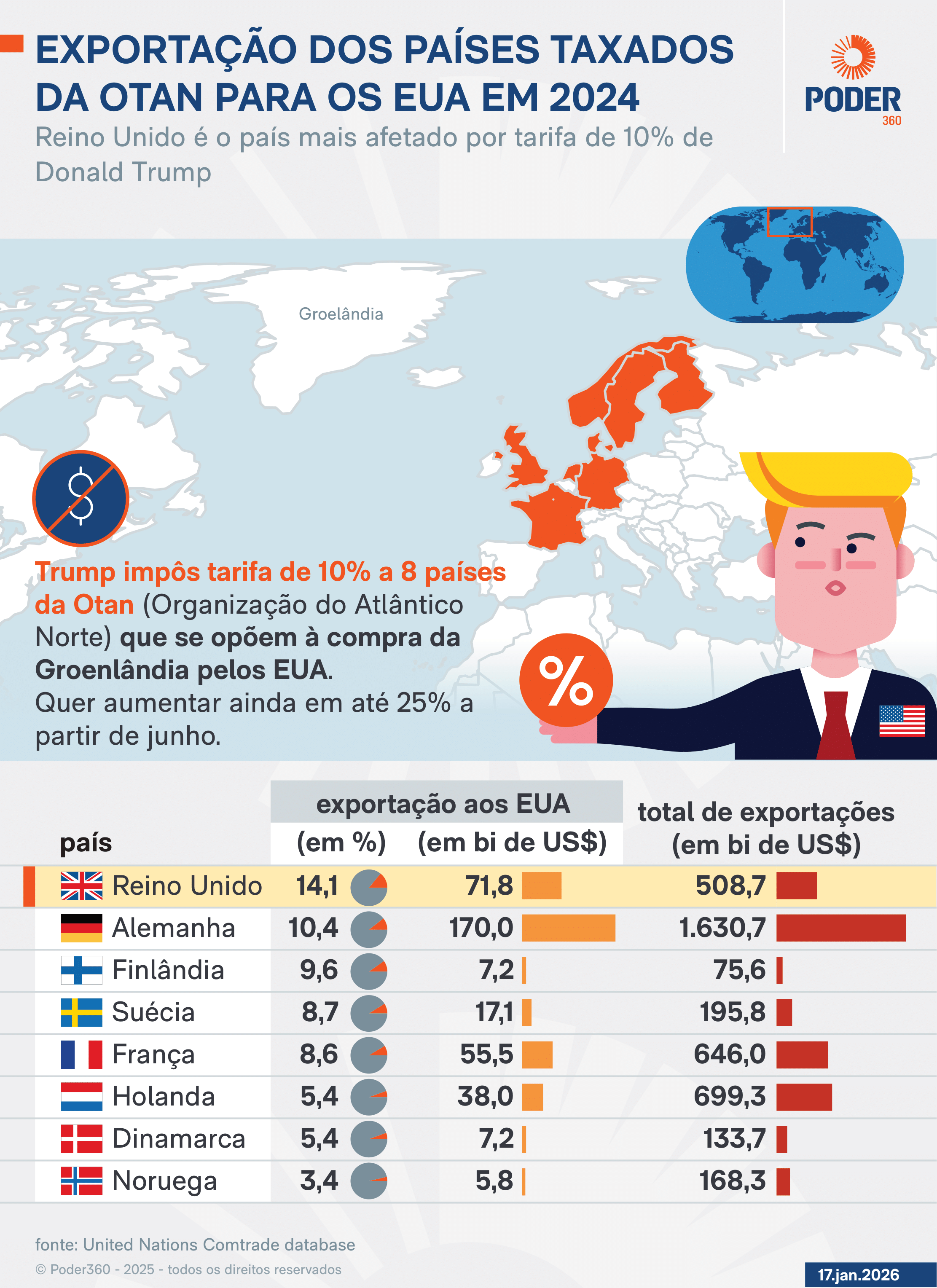 O Reino Unido é o país mais afetado pela tarifa de 10% anunciada neste sábado (17.jan.2026) pelo presidente dos Estados Unidos, Donald Trump (Partido Republicano), a 8 países da Otan (Organização do Tratado do Atlântico Norte) contrários à compra da Groenlândia pelo seu governo. As nações atingidas -Dinamarca, Noruega, Suécia, França, Alemanha, Reino Unido, Holanda e Finlândia são as mesmas que enviaram tropas ao território dinamarquês.