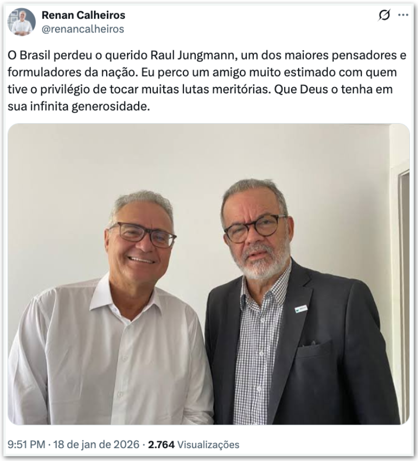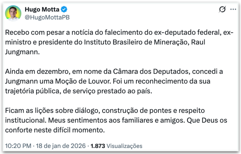 “Com imenso pesar, o Ibram (Instituto Brasileiro de Mineração) comunica o falecimento de Raul Belens Jungmann Pinto, diretor-presidente da instituição, ocorrido em 18 de janeiro de 2026, em Brasília. Em atenção a um desejo de Raul Jungmann, o velório ocorrerá em cerimônia reservada a familiares e amigos próximos.