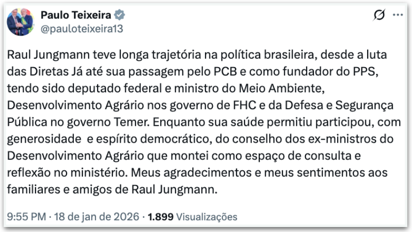 “O Fórum Brasileiro de Segurança Pública manifesta profundo pesar pelo falecimento do ex-ministro Raul Belens Jungmann Pinto, ocorrido neste domingo, 18 de janeiro de 2026.