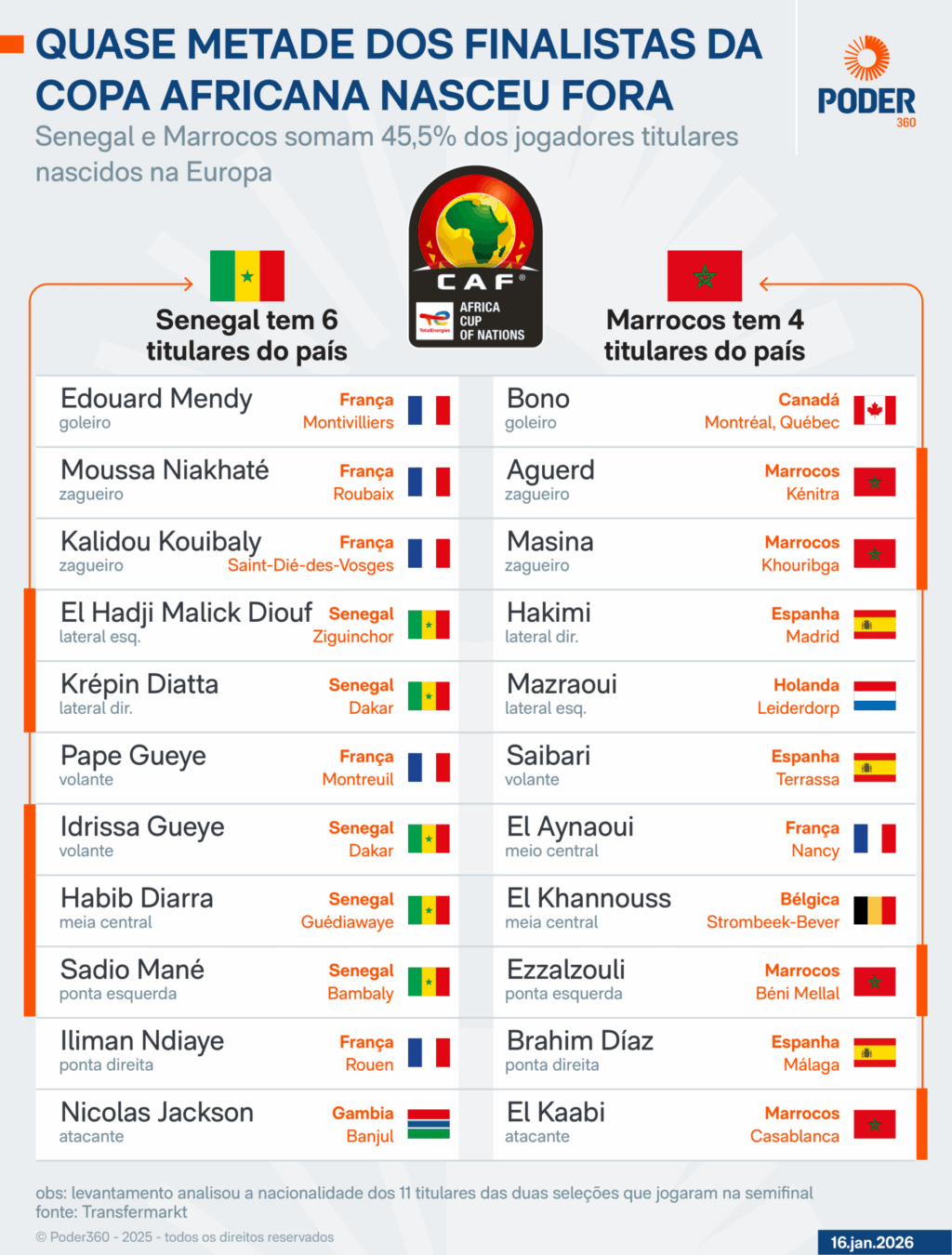A final da Copa Africana das Nações deste domingo (18.jan.2026) terá metade dos jogadores nascidos fora de seus respectivos países. Dos 55 atletas de Senegal e Marrocos, 25 nasceram na Europa, um nasceu na América do Norte e um em outro país africano.