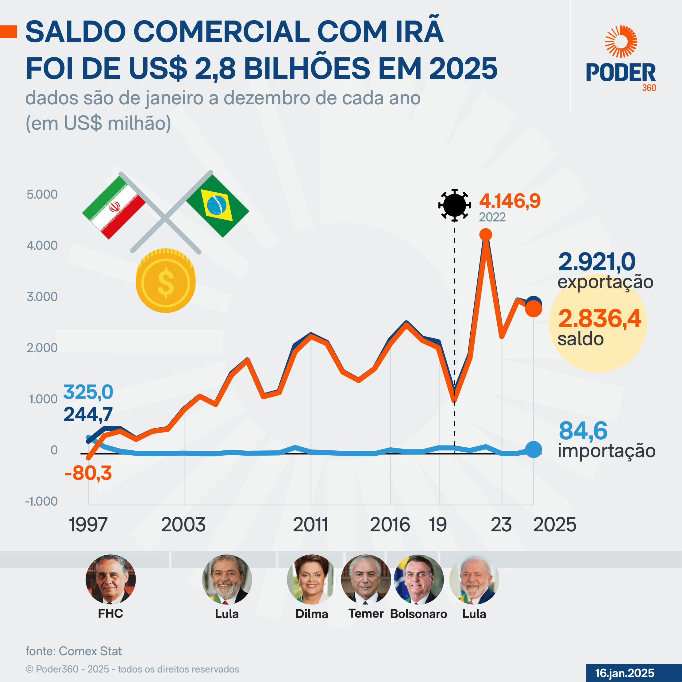 As exportações atingiram o ápice em 2022, sob o governo do ex-presidente Jair Bolsonaro (PL), com vendas de US$ 4,3 bilhões e saldo positivo de US$ 4,1 bilhões.