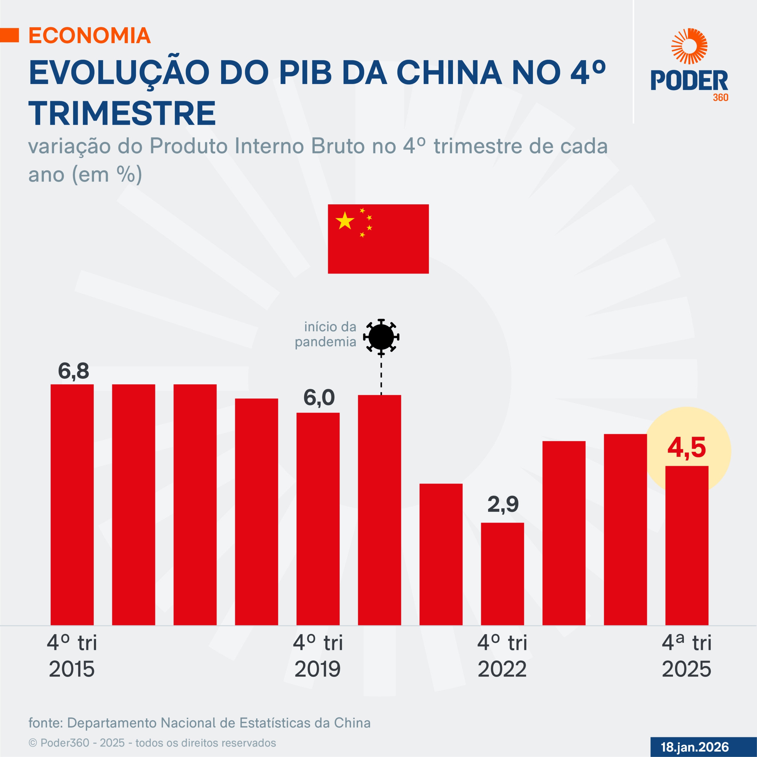 O PIB (Produto Interno Bruto) da China cresceu 5% em 2025 e ficou dentro da meta estabelecida pelo governo chinês, de “aproximadamente 5%”. No 4º trimestre, a atividade econômica avançou 4,5%.