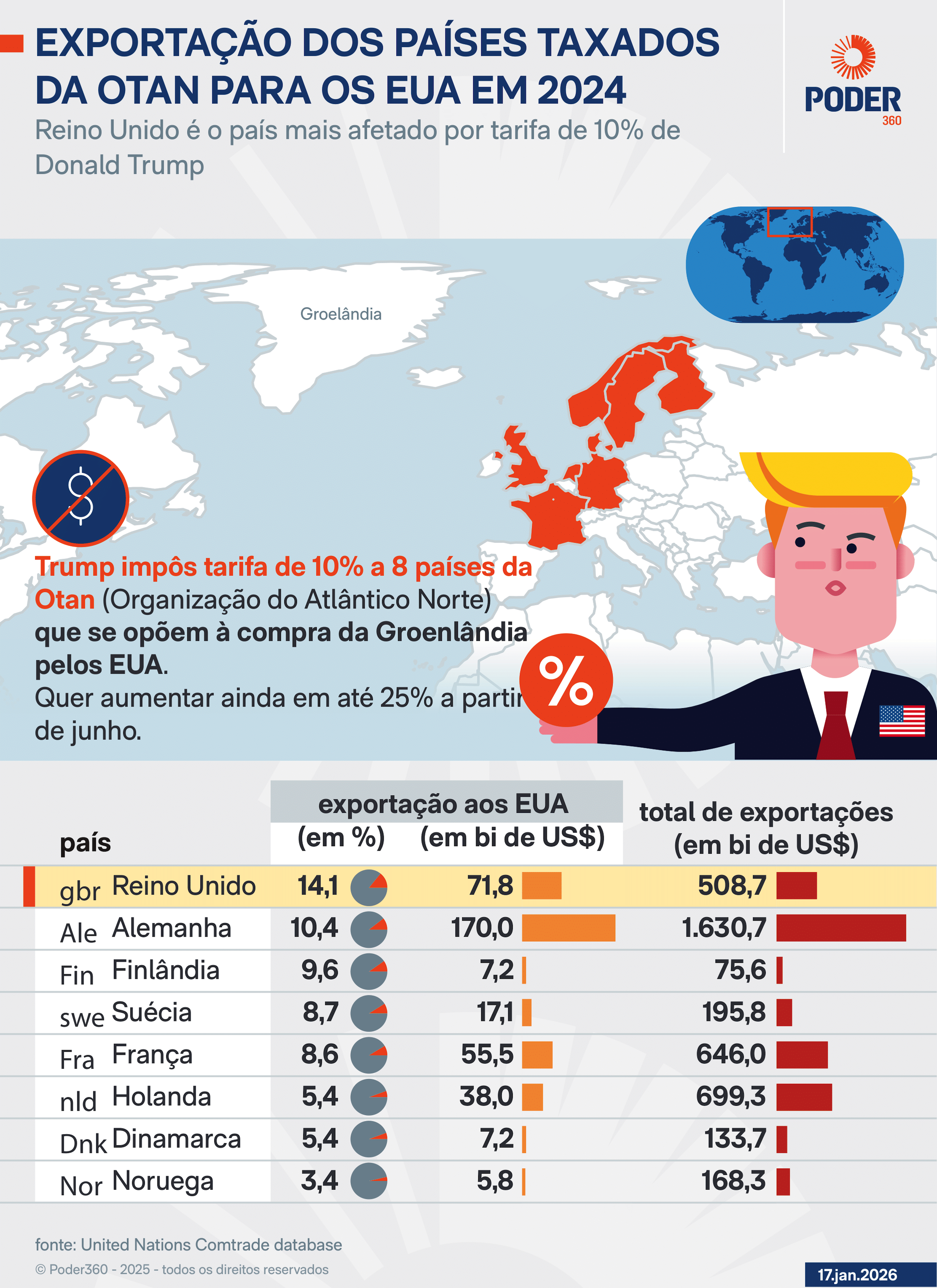 Donald Trump anunciou, no sábado (17.jan.2026), uma tarifa adicional de 10% a 8 países da Otan (Organização do Atlântico Norte) que se opõem à compra da Groenlândia pelo governo norte-americano.