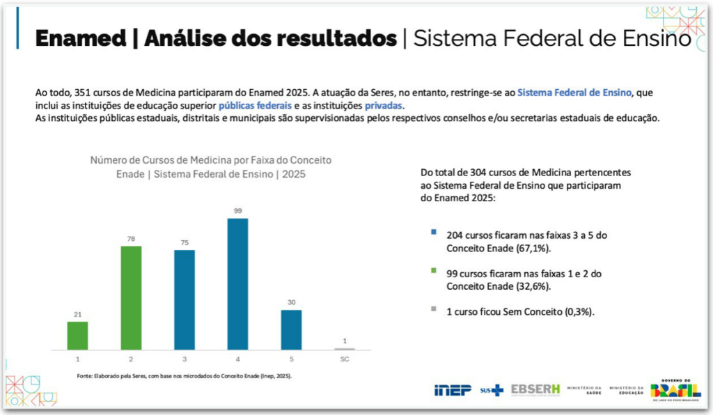 O Ministério da Educação anunciou nesta 2ª feira (19.jan.2026) que 99 cursos de medicina serão punidos pelo baixo desempenho no Enamed (Exame Nacional de Avaliação da Formação Médica). As medidas incluem restrição de vagas, suspensão de participação em programas federais e, em alguns casos graves, a desativação das atividades.