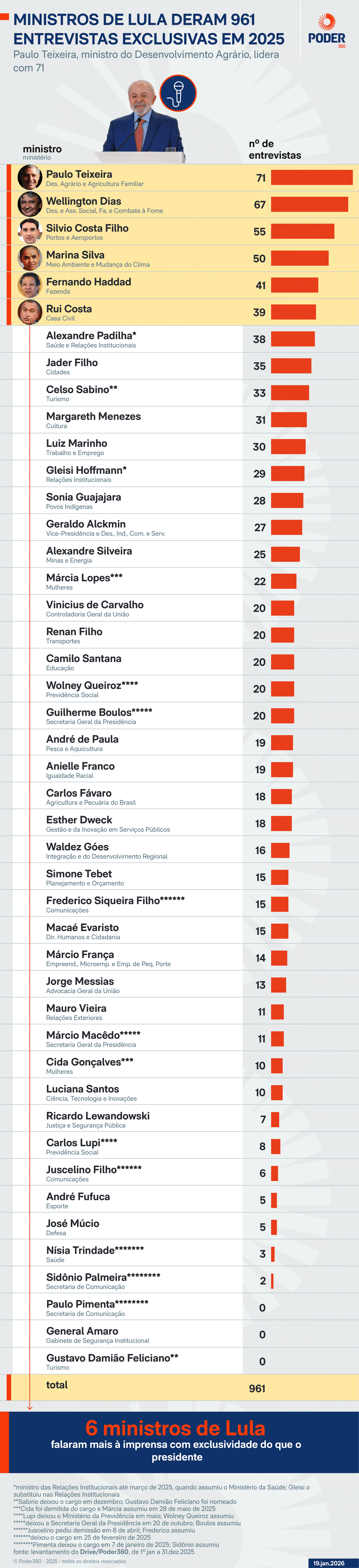 Os chefes de ministérios e secretarias do governo do presidente Luiz Inácio Lula da Silva (PT) concederam, juntos, ao menos 961 entrevistas exclusivas em 2025. Já o petista falou 38 vezes com exclusividade a veículos de comunicação, 5 a menos do que em 2025. A primeira-dama Janja Lula da Silva foi entrevistada em 9 oportunidades.