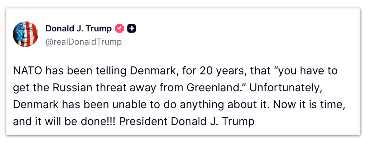 Em publicação na rede social Truth Social na madrugada desta 2ª feira (19.jan.2026), Trump escreveu: “A Otan [Organização do Tratado do Atlântico Norte] vem dizendo à Dinamarca, há 20 anos, que ‘é preciso afastar a ameaça russa da Groenlândia’. Infelizmente, a Dinamarca não conseguiu fazer nada a respeito. Agora é a hora, e isso será feito”.
