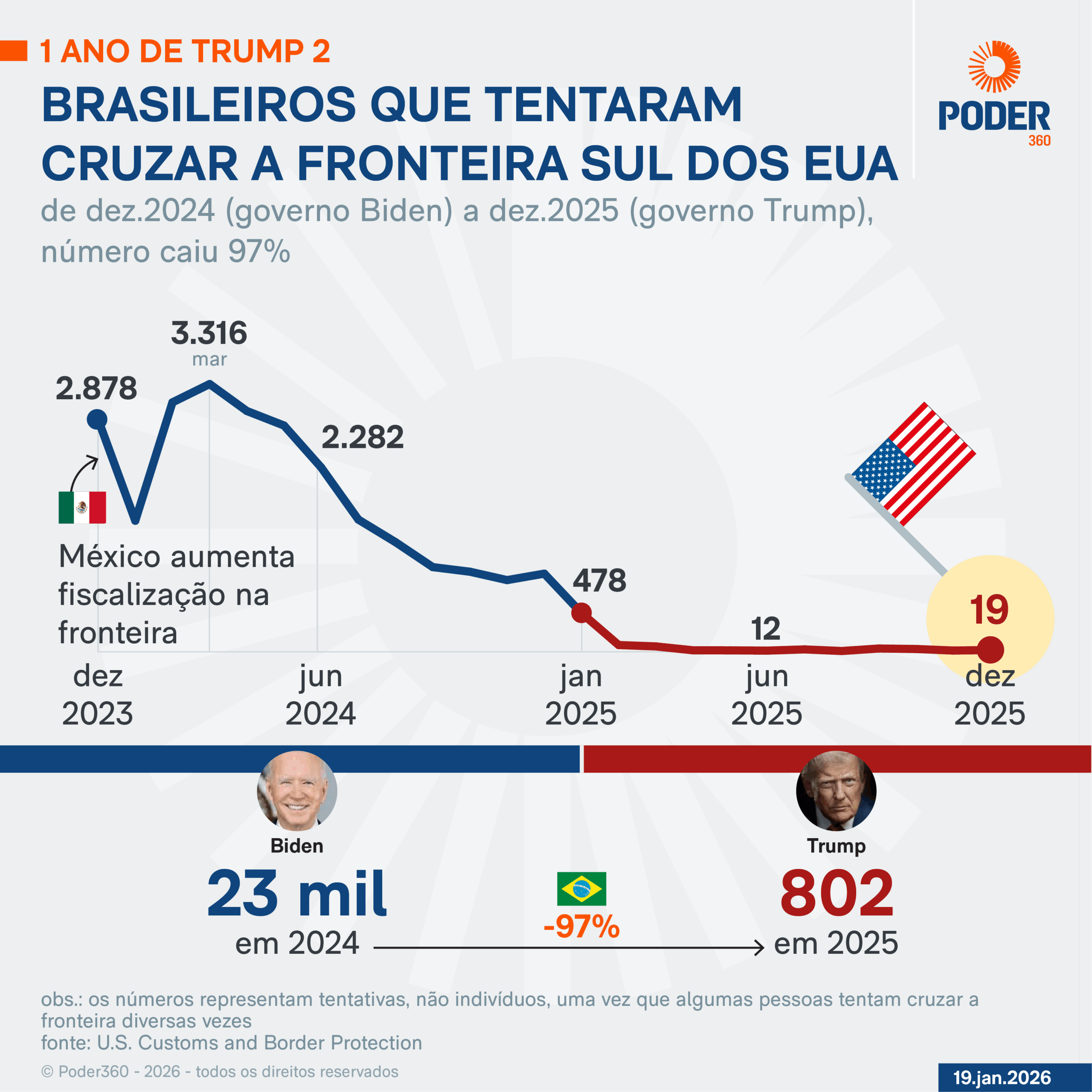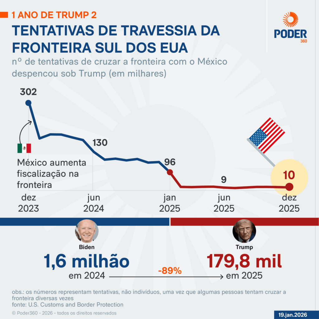 Na comparação do último ano de Joe Biden (Partido Democrata) na Casa Branca para o 1º ano do 2º mandato de Trump, houve redução de 89% nas tentativas de entrada na fronteira sudoeste, entre os Estados Unidos e o México. No mesmo período, a queda nas tentativas realizadas por brasileiros foi de 97%.