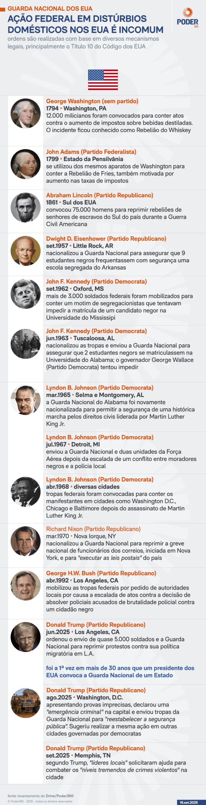 Em seu 2º mandato, Trump nacionalizou tropas estaduais sem a permissão do governador do Estado pela 1ª vez desde 1965. Os militares foram enviados a Washington, D.C, onde o presidente tem maior autonomia, Los Angeles e Memphis —cidades governadas por democratas.