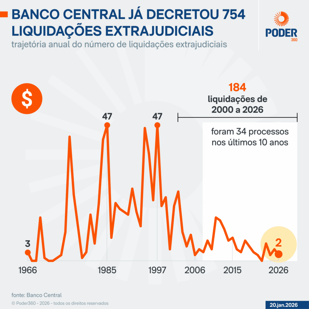 Dados do Banco Central mostram que 570 das 754 liquidações extrajudiciais aplicadas pelo Banco Central foram realizadas de 1966 a 1999, ou 76% do total. As 184 restantes foram realizadas de 2000 a 2026.
