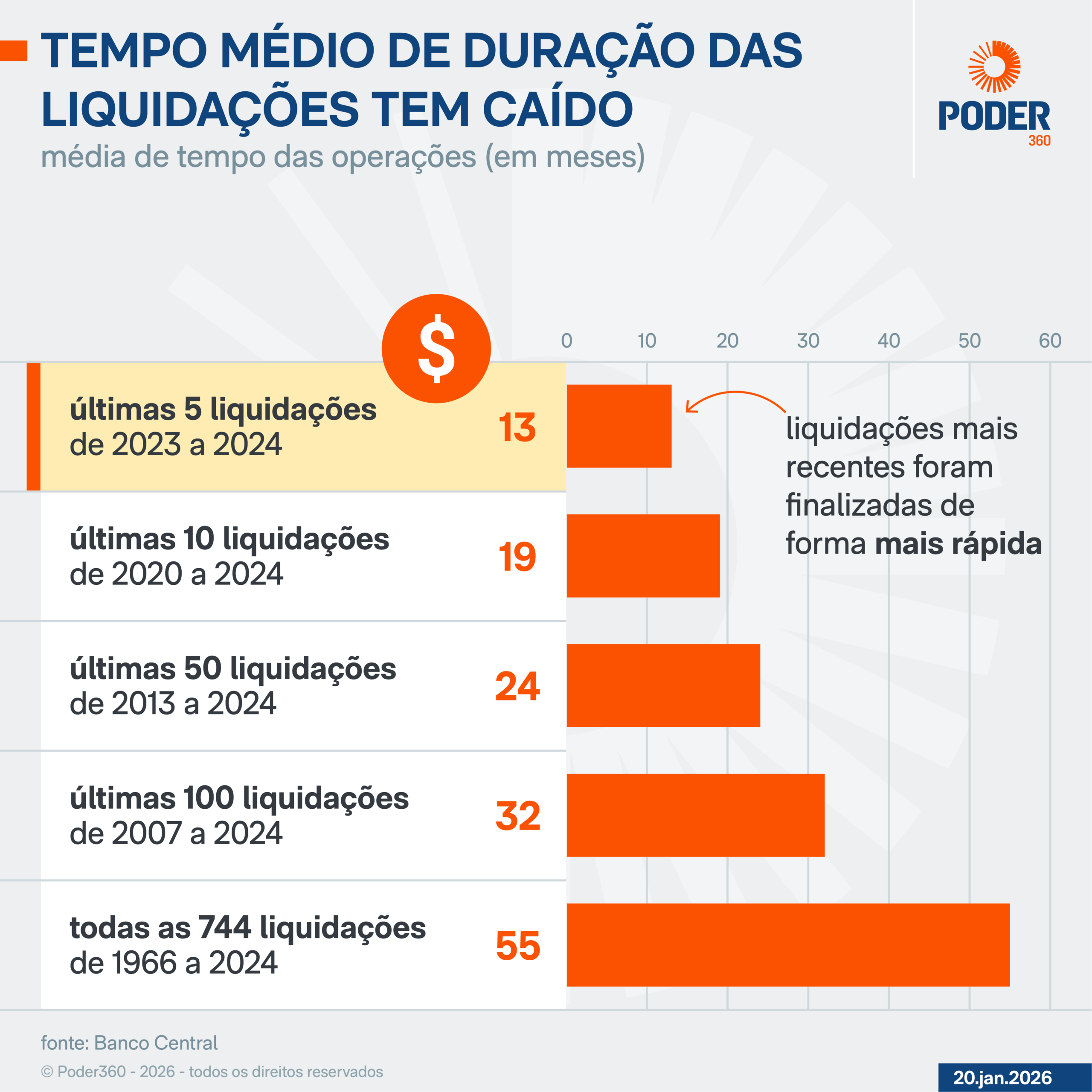 Em média, o BC leva 4,6 anos (55 meses) para encerrar uma liquidação, independentemente do resultado do processo de intervenção. O prazo considera todas as 744 liquidações realizadas de 1996 a 2024.