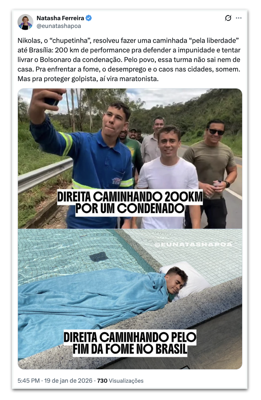Políticos do PT (Partido dos Trabalhadores) reagiram, nesta 2ª feira (19.jan.2026), com ironia à caminhada anunciada pelo deputado Nikolas Ferreira (PL-MG), de Paracatu até Brasília. Em um trajeto de 240 km, a caminha é feita, segundo o deputado, em defesa da “liberdade” do ex-presidente Jair Bolsonaro (PL), como pressão ao ministro Alexandre de Moraes, do STF (Supremo Tribunal Federal) a soltá-lo da prisão.