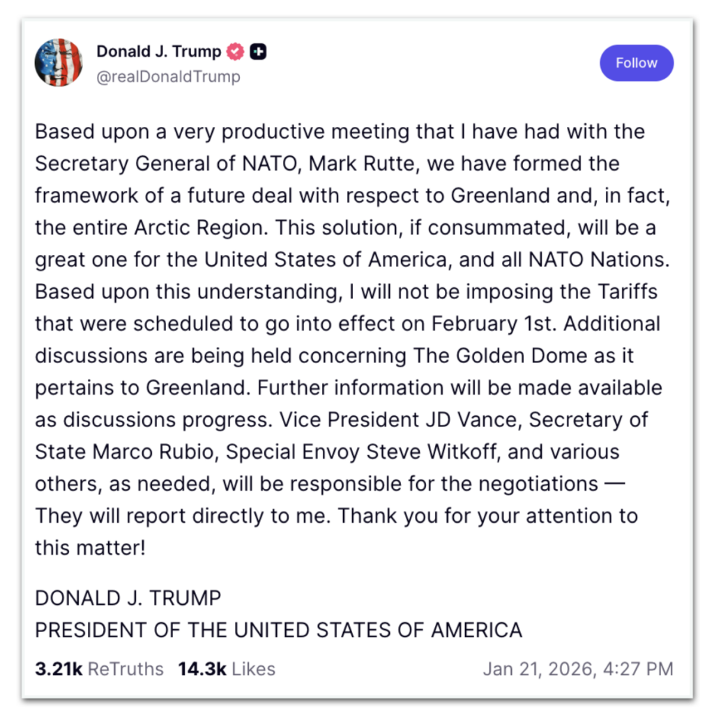 “Com base em uma reunião muito produtiva que tive com o Secretário-Geral da OTAN, Mark Rutte, formamos a estrutura de um acordo futuro em relação à Groenlândia e, de fato, a toda a Região Ártica. Esta solução, se consumada, será ótima para os Estados Unidos da América e todas as nações da OTAN. Com base nesse entendimento, não vou impor as Tarifas que estavam programadas para entrar em vigor em 1o de fevereiro. Discussões adicionais estão sendo realizadas sobre o The Golden Dome no que diz respeito à Groenlândia. Mais informações serão disponibilizadas à medida que as discussões avançam. O vice-presidente JD Vance, o secretário de Estado Marco Rubio, o enviado especial Steve Witkoff e vários outros, conforme necessário, serão responsáveis pelas negociações — Eles se reportarão diretamente a mim. Obrigado por sua atenção a este assunto!”.