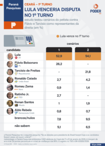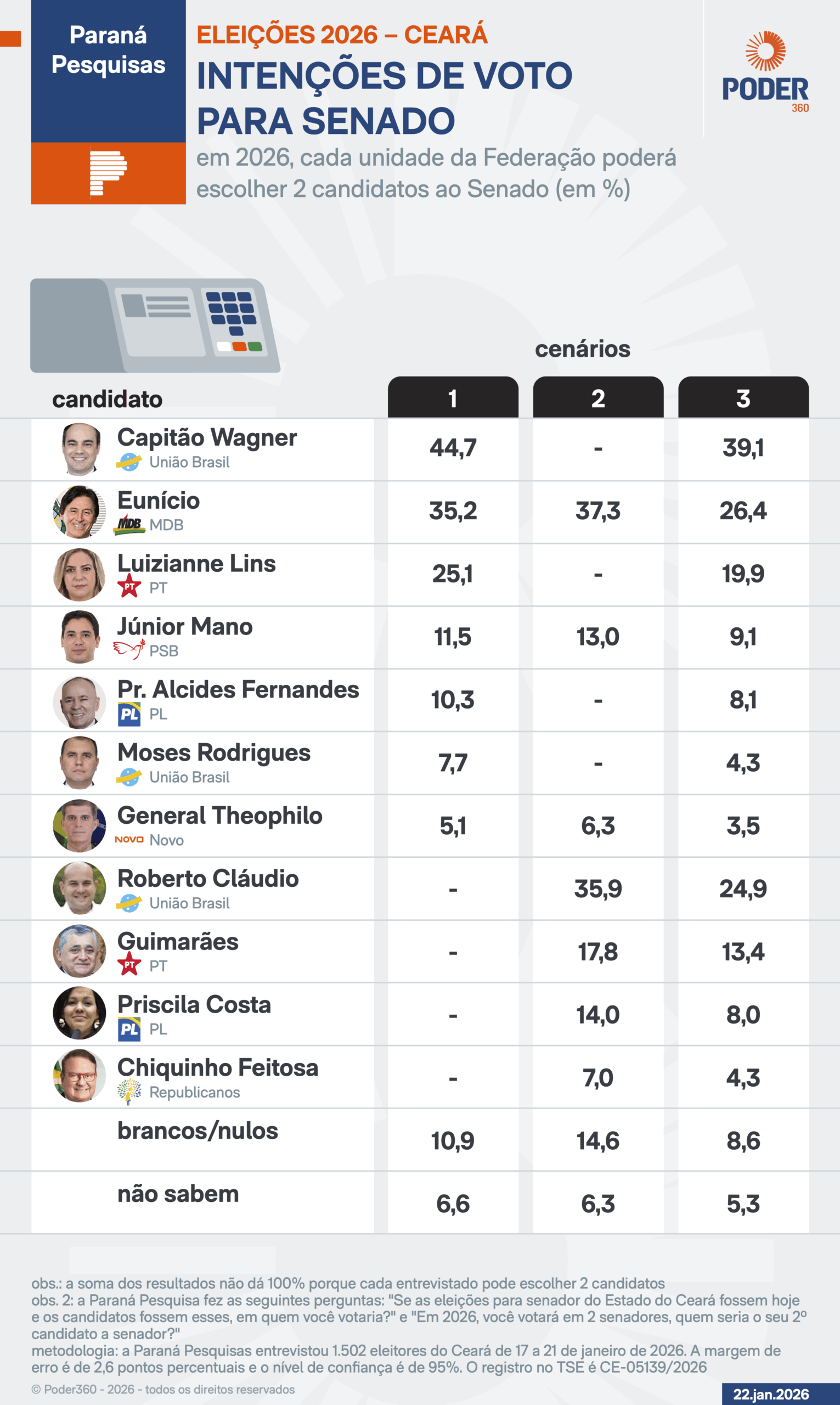 O ex-deputado federal Capitão Wagner (União Brasil) lidera as intenções de voto para o Senado no Ceará, segundo levantamento da Paraná Pesquisas divulgado nesta 5ª feira (22.jan.2026). Wagner aparece com 44,7% das intenções de voto no 1º cenário, com 11 nomes testados. O deputado Eunício aparece em 2º lugar, com 35,2%, seguido pela deputada Luizianne Lins (PT) que soma 25,1%.