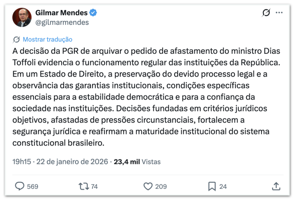 Em publicação compartilhada em seu perfil no X, o decano do STF afirmou que a decisão da PGR “evidencia o funcionamento regular das instituições da República”.