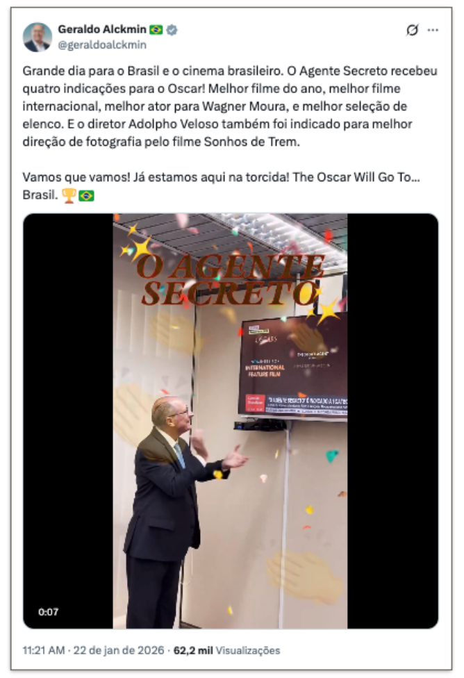 O vice-presidente Geraldo Alckmin (PSB) afirmou que o dia é “grande para o Brasil e para o cinema brasileiro” e destacou as indicações nas categorias de Melhor Filme, Melhor Filme Internacional, Melhor Ator, para Wagner Moura, e Melhor Elenco.