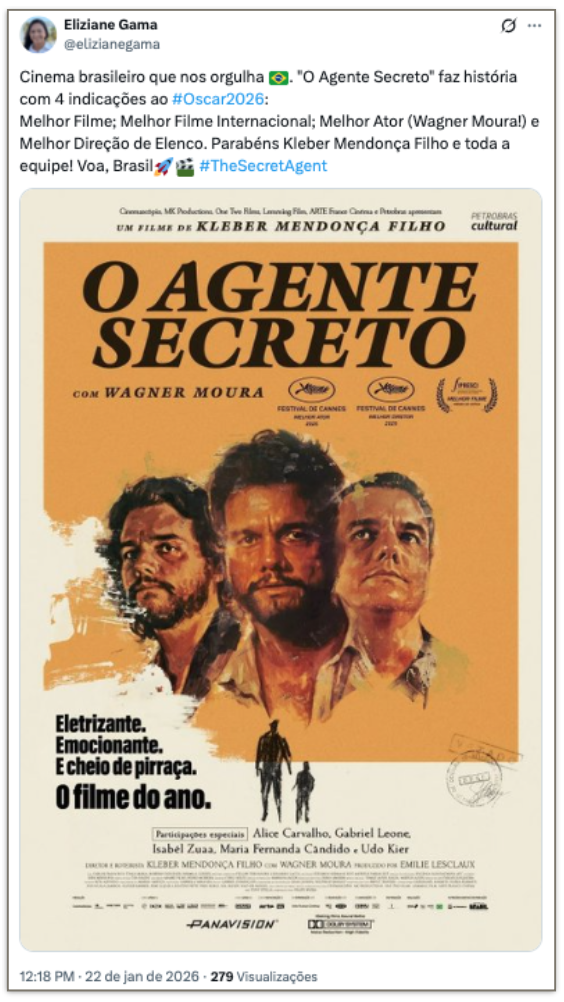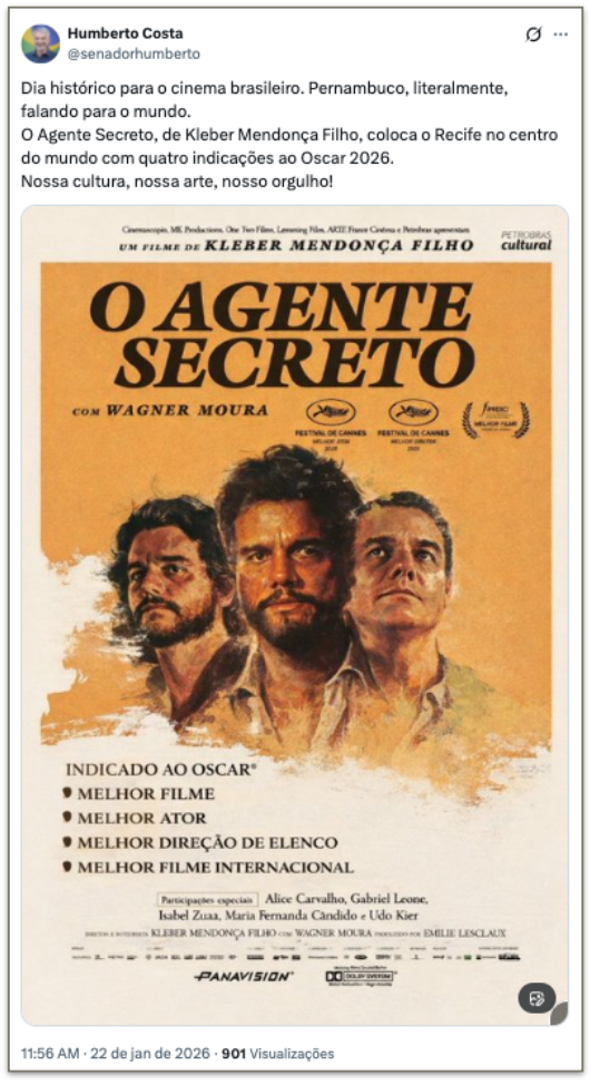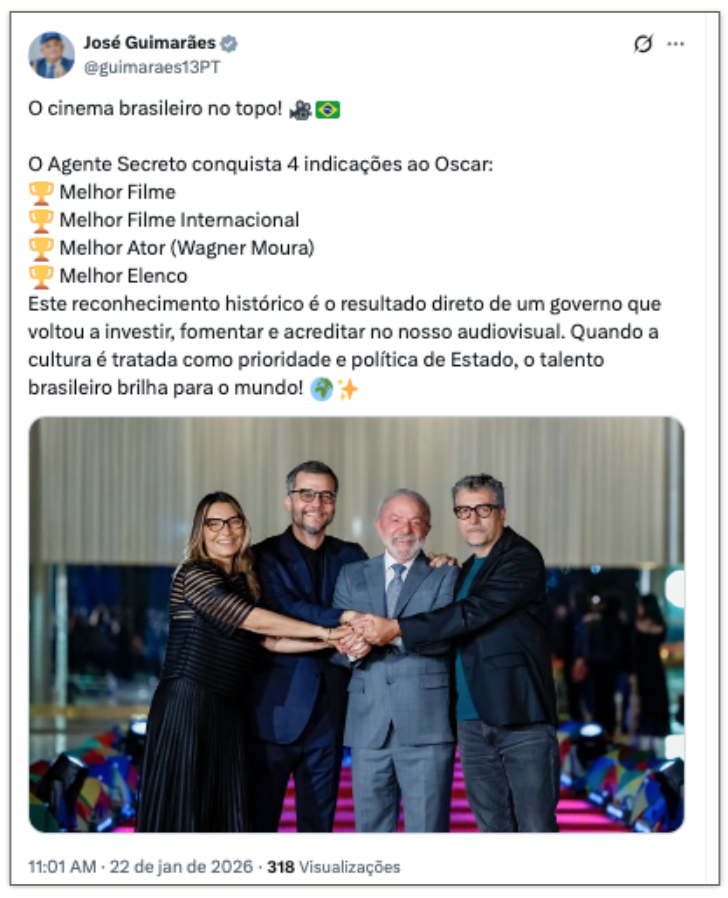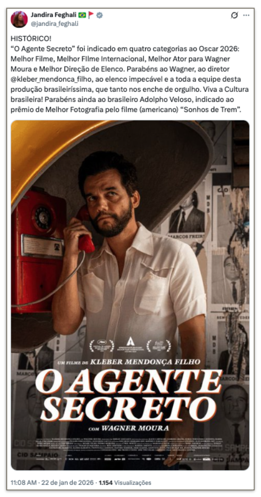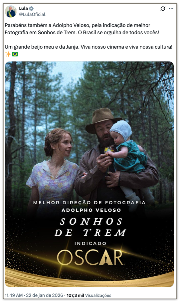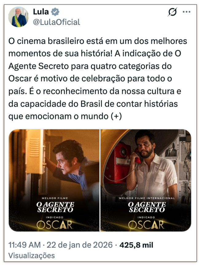 O presidente Luiz Inácio Lula da Silva (PT) e líderes do governo federal celebraram as 4 indicações ao Oscar do filme “O Agente Secreto” nesta 5ª feira (22.jan.2026). Nas redes sociais, classificaram as indicações como “históricas” para o cinema brasileiro, parabenizaram e celebraram o reconhecimento internacional da produção nacional.