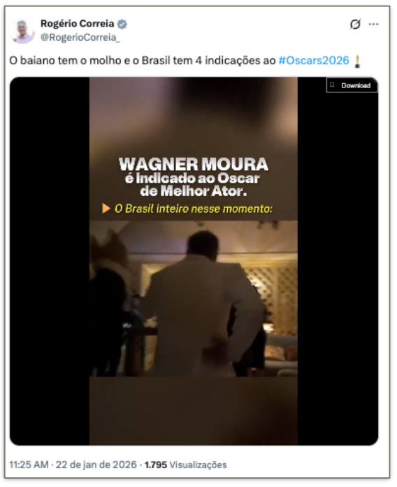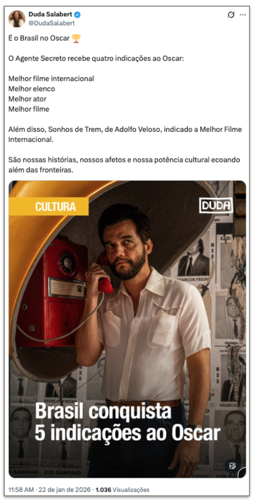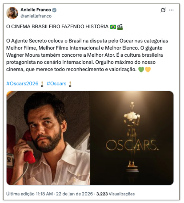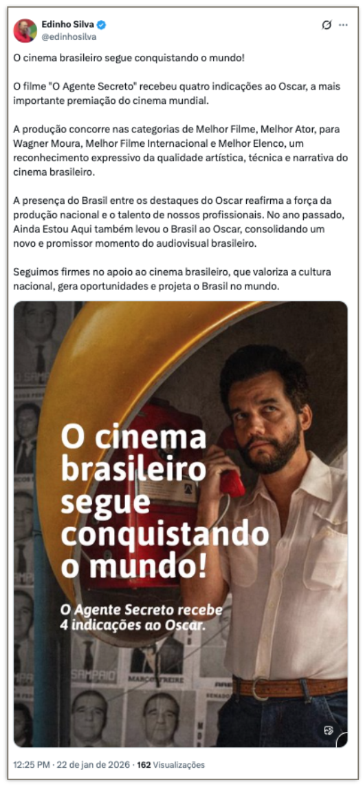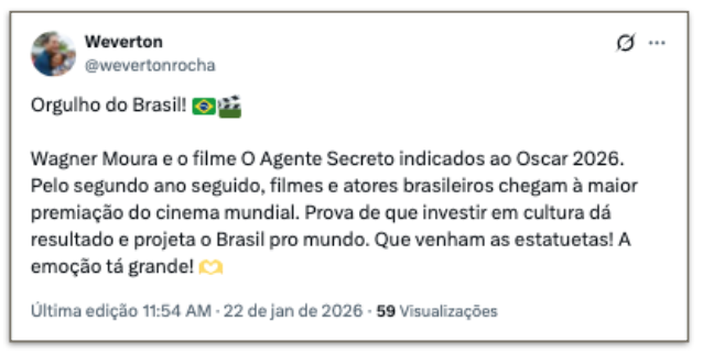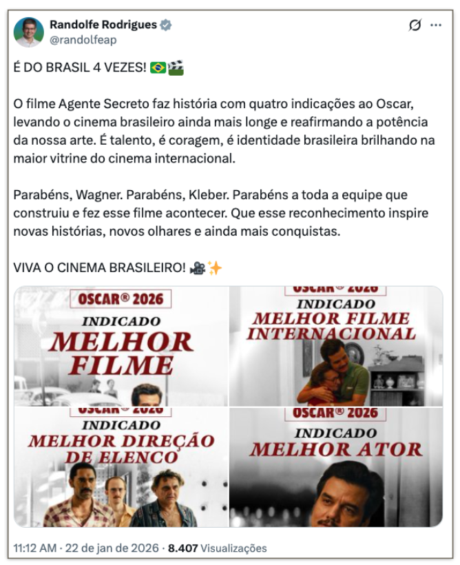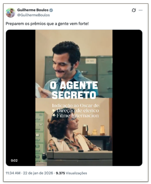 O presidente Luiz Inácio Lula da Silva (PT) e líderes do governo federal celebraram as 4 indicações ao Oscar do filme “O Agente Secreto” nesta 5ª feira (22.jan.2026). Nas redes sociais, classificaram as indicações como “históricas” para o cinema brasileiro, parabenizaram e celebraram o reconhecimento internacional da produção nacional.