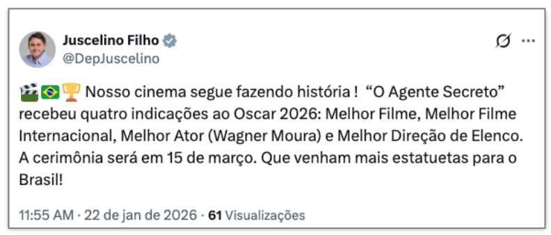 O deputado Juscelino Filho (União Brasil-MA), ex-ministro das Comunicações de Lula, destacou que o país segue acumulando indicações e que espera “mais estatuetas” para o Brasil.