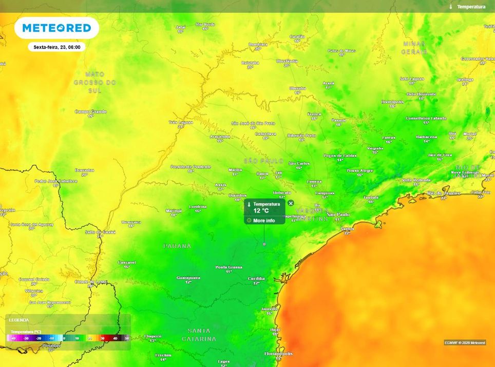 Nesta sexta-feira (23), a manhã começa fria em boa parte de São Paulo, com temperaturas mínimas entre 15°C e 17°C, mas podendo cair para os 12°C no extremo sul do estado; no extremo oeste, em áreas de divisa com o Mato Grosso do Sul, as mínimas chegam aos 20°C.