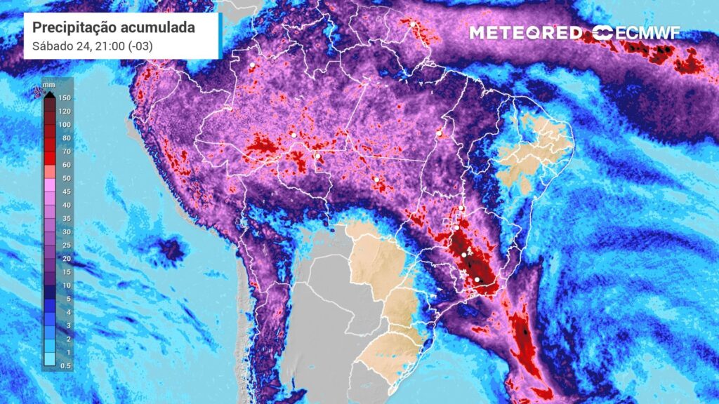 O sábado (24) também será marcado por chuvas volumosas em áreas do Centro-Oeste e do Sudeste do Brasil. Durante a madrugada, pancadas de chuva ocorrem de forma generalizada nessas regiões, porém com menor intensidade em relação à sexta-feira (23).
