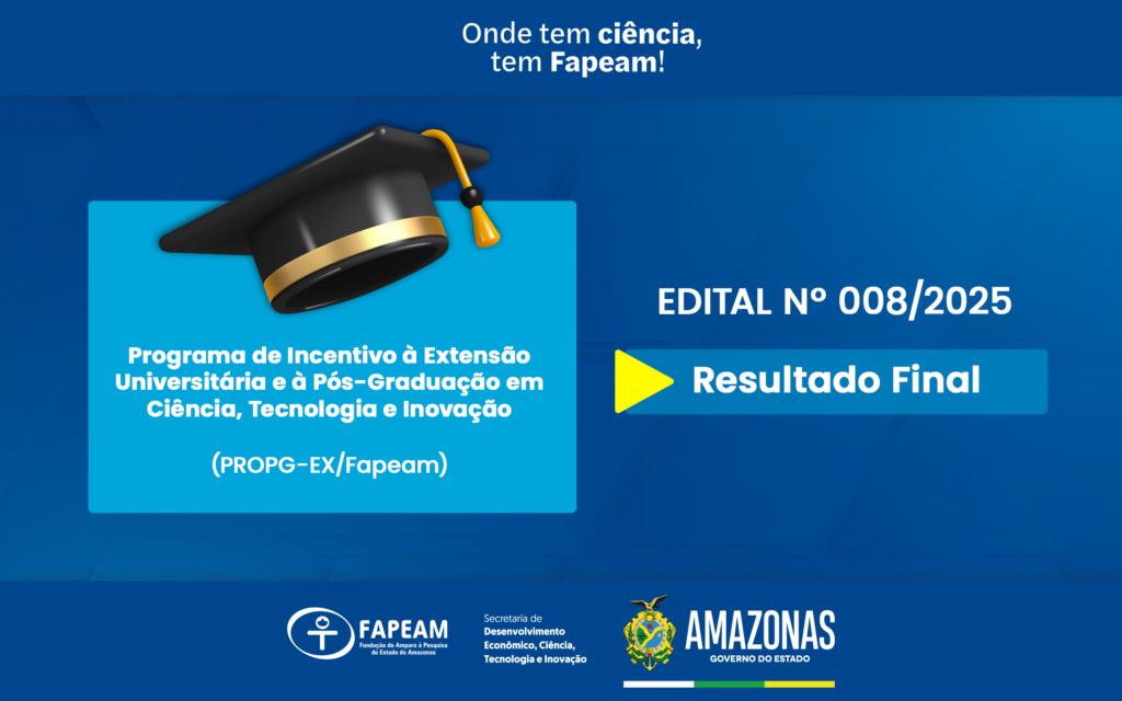 O Governo do Amazonas, por meio da Fundação de Amparo à Pesquisa do Estado do Amazonas (Fapeam), divulgou nesta sexta-feira (23/1), o resultado final do Programa de Incentivo à Extensão Universitária e à Pós-Graduação em Ciência, Tecnologia e Inovação (PROPG-EX/Fapeam), edital nº 008/2025.