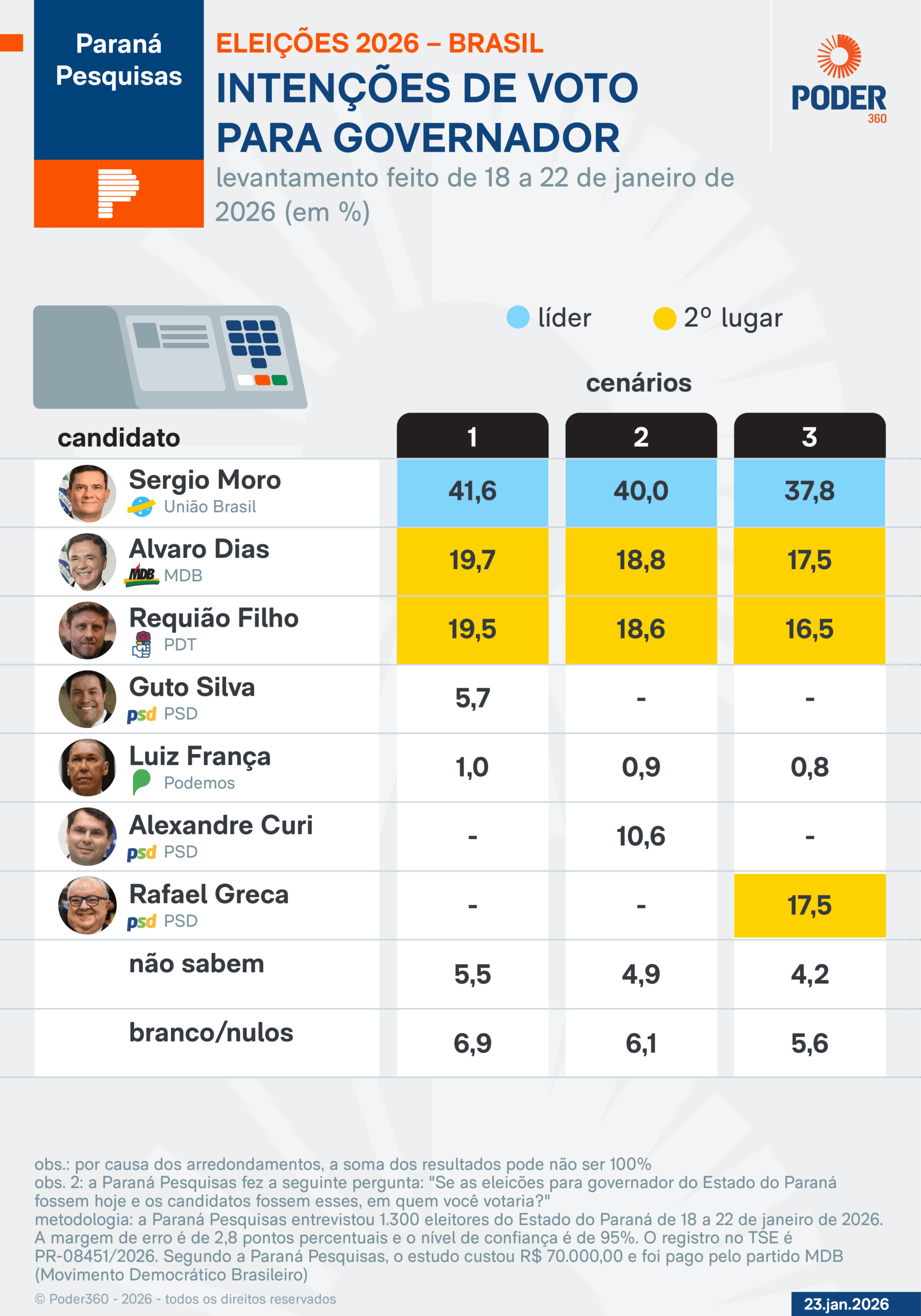 No 1º cenário, Moro tem 41,6% das intenções de voto. Na sequência, aparecem empatados, dentro da margem de erro (2,8 pontos), o ex-senador Alvaro Dias (Podemos), com 19,7%, e o deputado estadual Requião Filho (PDT), com 19,5% das intenções de voto.