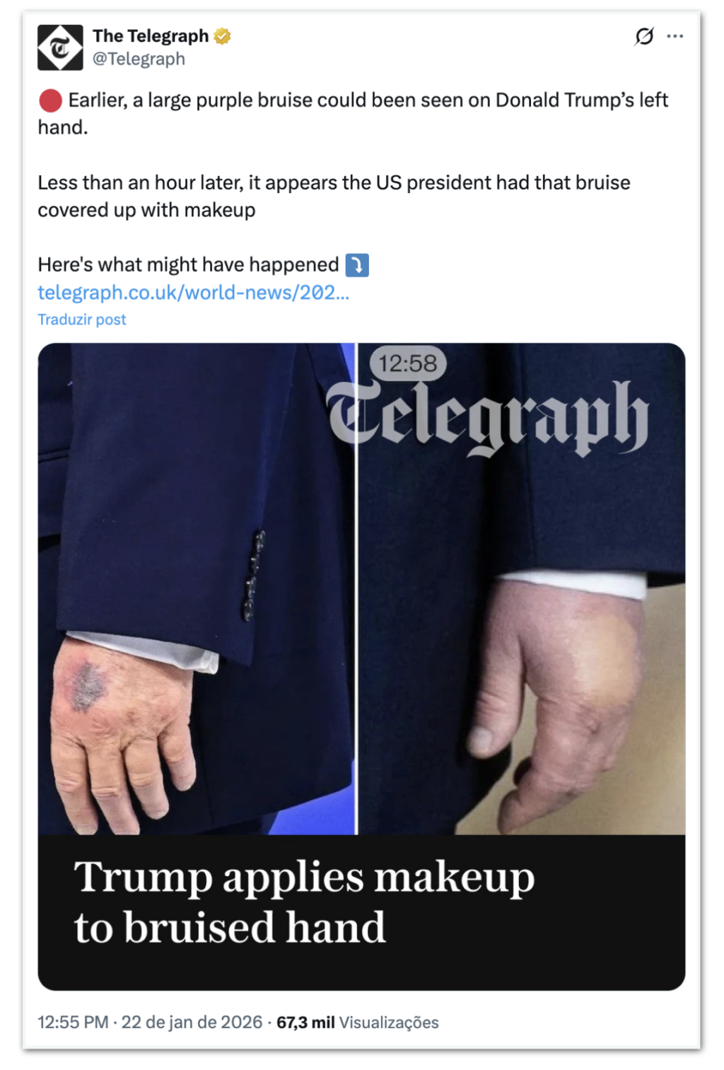 O presidente dos Estados Unidos, Donald Trump (Partido Republicano), foi visto com um novo hematoma na mão durante reunião do Conselho da Paz, em Davos, na 5ª feira (22.jan.2026). Depois da divulgação de fotos do evento nas redes sociais, o estado de saúde do presidente voltou a ser questionado.